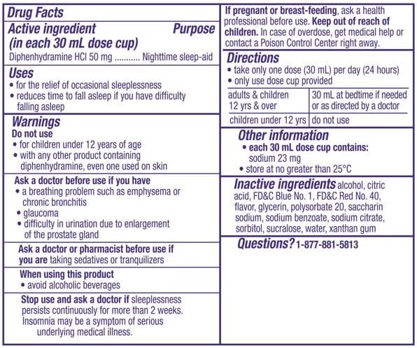 Each 30 mL dose contains diphenhydramine HCl (50 mg)
