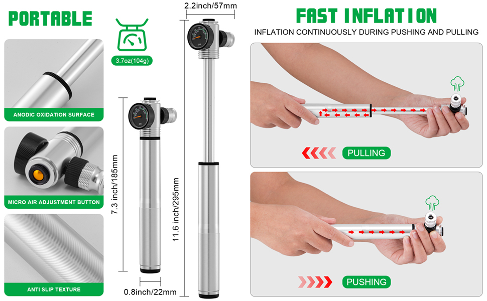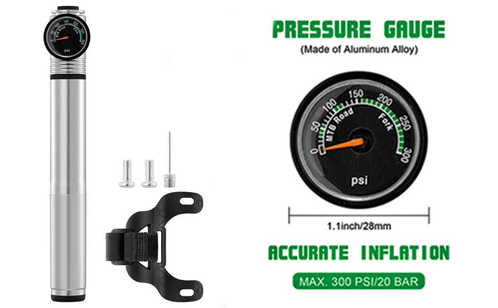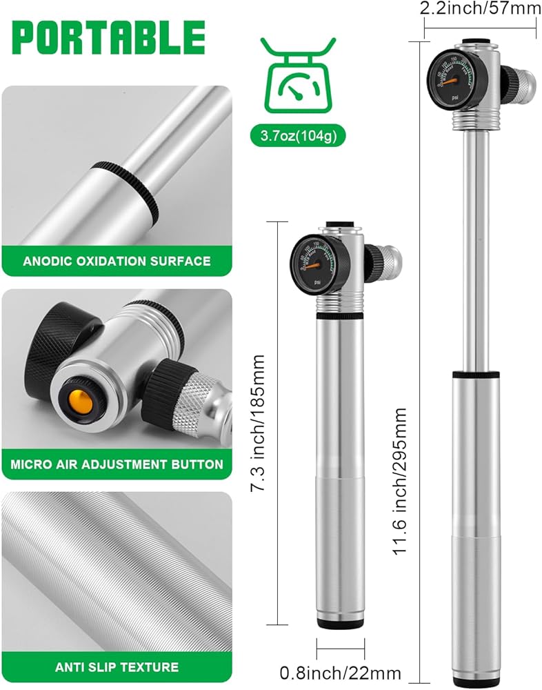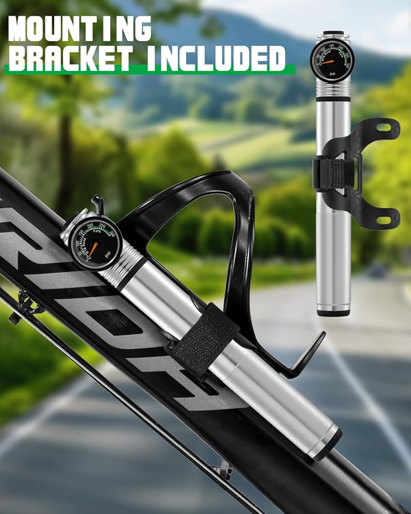 Ultra-Portable Design: Length 7.3 inch/185mm, Weighing only 3.7oz(104g), this bike tire inflator portable is your perfect on-the-go companion. Easily attach it to your bike frame using the included secure bracket and Velcro strap.