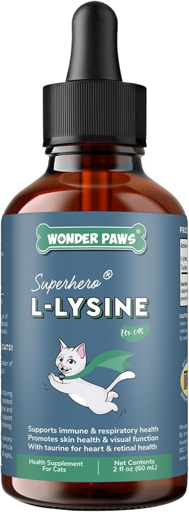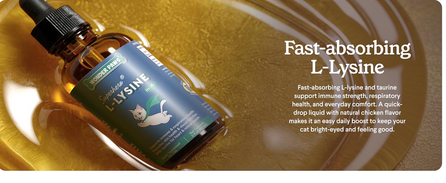 POWERFUL L-LYSINE FOR CATS: Wonder Paws lysine supplement for cats uses a powerful dose of l-lysine to support immune health, respiratory health and eye health in cats of all ages and sizes. Our liquid l-lysine for cats includes taurine, a powerful amino acid that supports eye, heart, immune and digestive health. Each lysine drop of our delicious natural chicken flavored lysine liquid includes 250mg of lysine and a powerful dose of taurine to deliver real results for your kitten or cat. L-Lysine for cats is specially formulated to support your cat's overall well-being. Our immune support for cats supplement is the perfect on raw food, kibble or just by itself!