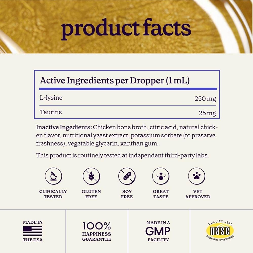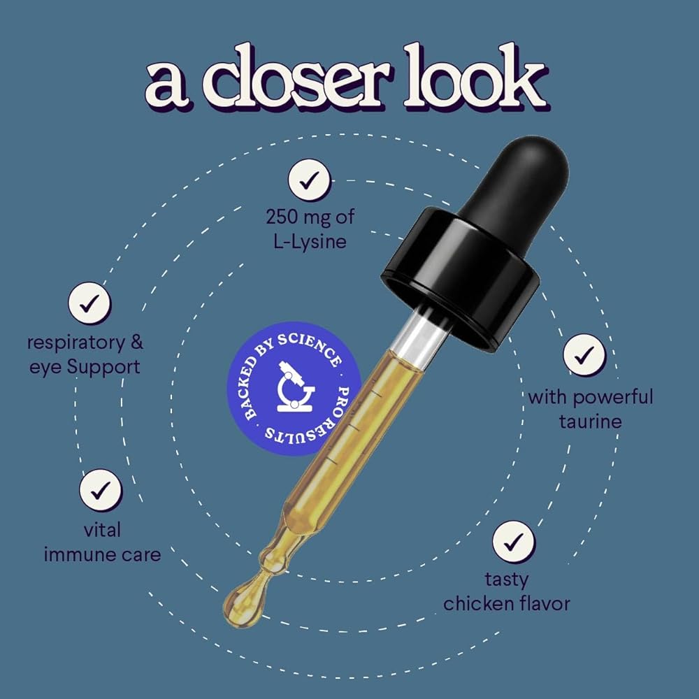 IMMUNE & RESPIRATORY HEALTH: Our daily l-lysine drops for cats and kittens is formulated to help manage common feline health challenges and supports your cat's immune system, respiratory health and helps support occasional relief from sneezing, watery eyes and runny nose as part of normal daily exposure to the environment. Just 1-2 drops of our delicious chicken flavored cat lysine supplement uses powerful doses of l-lysine and taurine to deliver daily cat immune support, so your pet can live happier and healthier days.