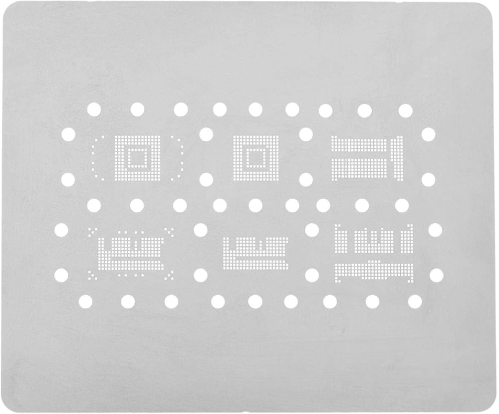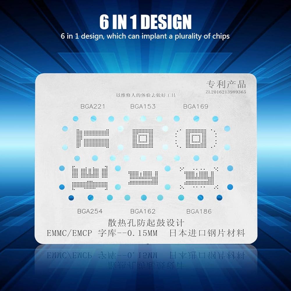 Net stencils adopts a 6-in-1 design and can be implanted with multiple chips, is made of high-quality stainless steel plate, the thickness of the steel mesh is appropriate,uses a special plump design to avoid heat dissipation and can be heated by a hot air blower,is simple and fast to reball BGA IC, it is a practical and economical accessory for BGA soldering,is specially designed for BGA153/162/169/186/221/254/EMMC.