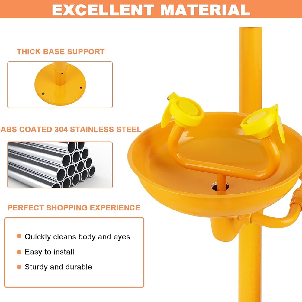 ABS COATING: The eye wash shower is made of high quality SS304 stainless steel. And then coated by ABS powder coating. Make the product surface more smooth and corrosion resistant. The overall yellow color is eye-catching. Suitable for indoor and outdoor is use.