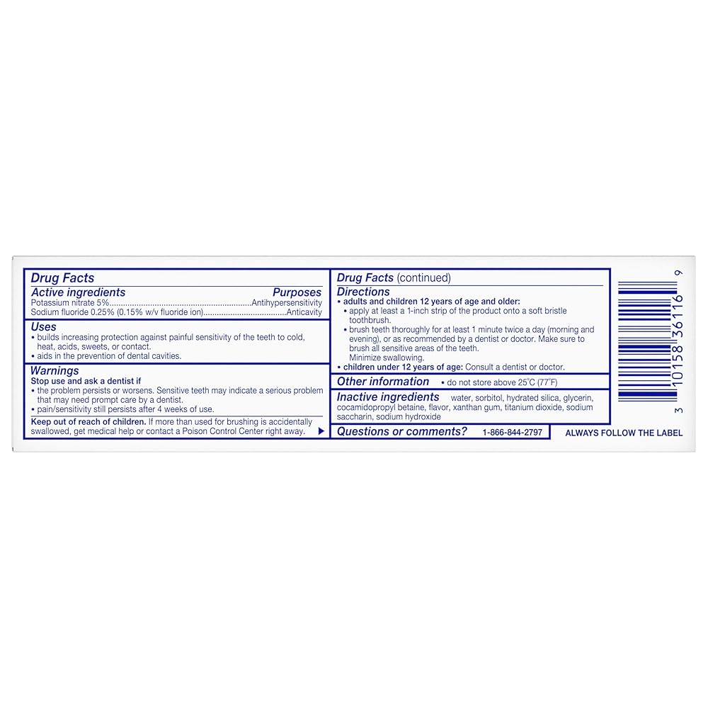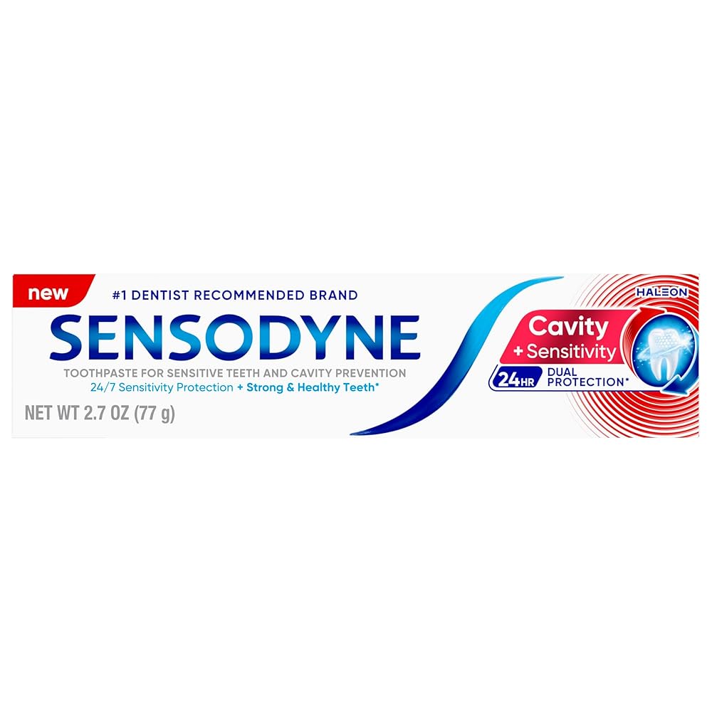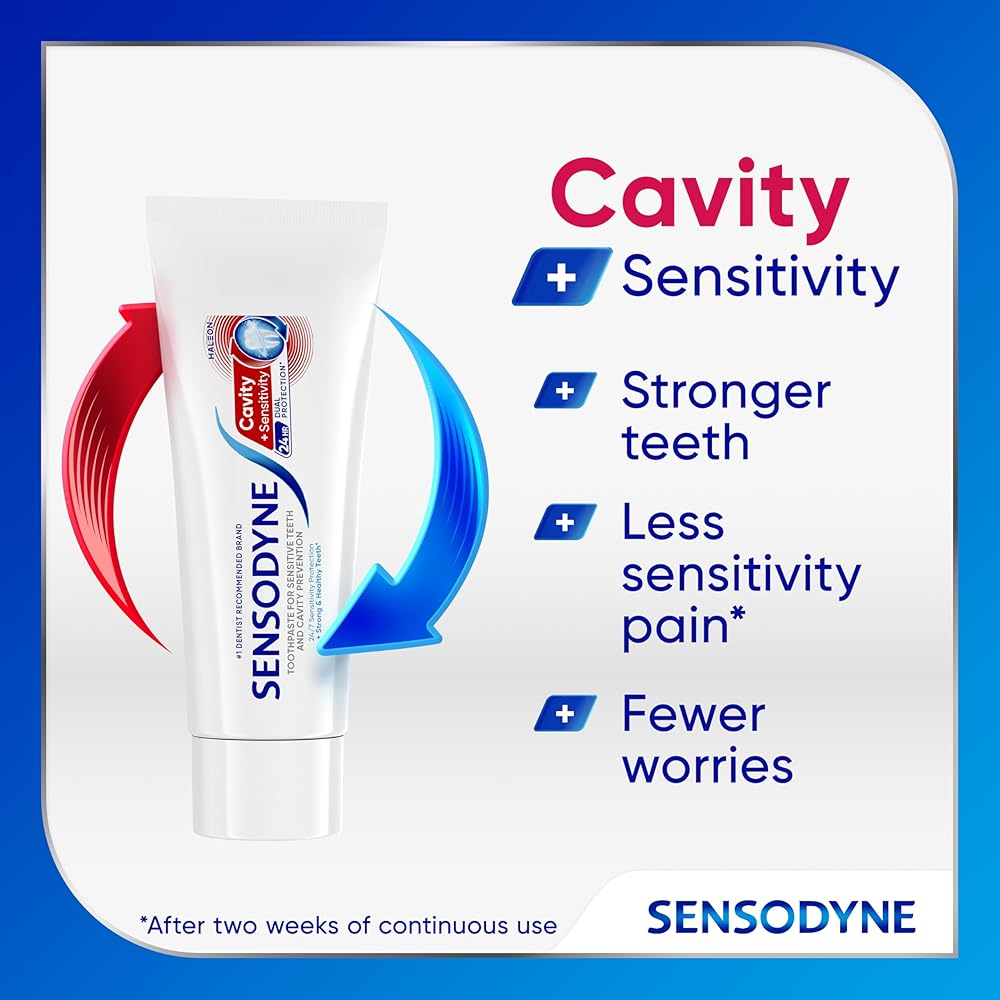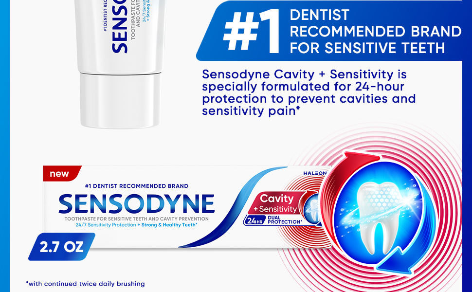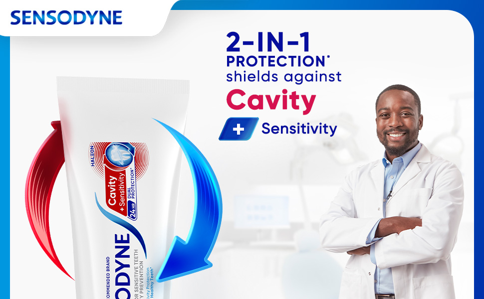 Sensodyne Cavity + Sensitivity Toothpaste offers 2-in-1 protection: shielding against cavities and tooth sensitivity (1). It is specially formulated for 24-hour protection to prevent cavities (1) and sensitivity pain (1) with its combination of optimized fluoride to help remineralize teeth and potassium nitrate to relive sensitivity pain. With regular use, this dual-protection fluoride toothpaste replenishes minerals essential for keeping teeth strong, helping counteract daily wear from acidic food and drink. Experience long-lasting sensitivity protection (1) from a toothpaste infused with refreshing mint for great taste and fresh breath. Sensodyne is the #1 dentist-recommended brand for sensitive teeth. Use twice daily for maximum cavity and sensitivity protection. Stop compromising - start being sensitivity – and cavity-free (1). (1) With continued twice daily brushing