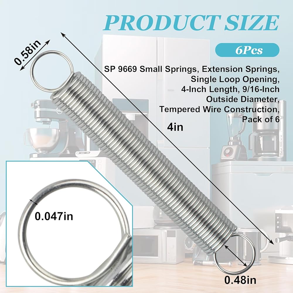Product Information: Part Number 9669, Extension Springs, Small Springs. 9/16 inch OD, 4 inch length, 0.047 inch wire diameter, 6.7 pound maximum safe load, 7.42 inch maximum deflection. With your purchase you will receive 6 brand new 9669 extension springs