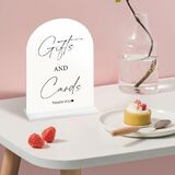 This 5x7 inch black arched acrylic cards and gifts sign with stand is designed to elevate your wedding reception or event party tables. Crafted from high-quality 1/8" thick acrylic material, this sign offers durability and stability while maintaining an elegant aesthetic. Its sleek arched design features clean lines and a beautiful calligraphy cursive font that complements rustic, vintage, country, garden, or woodland-themed weddings.