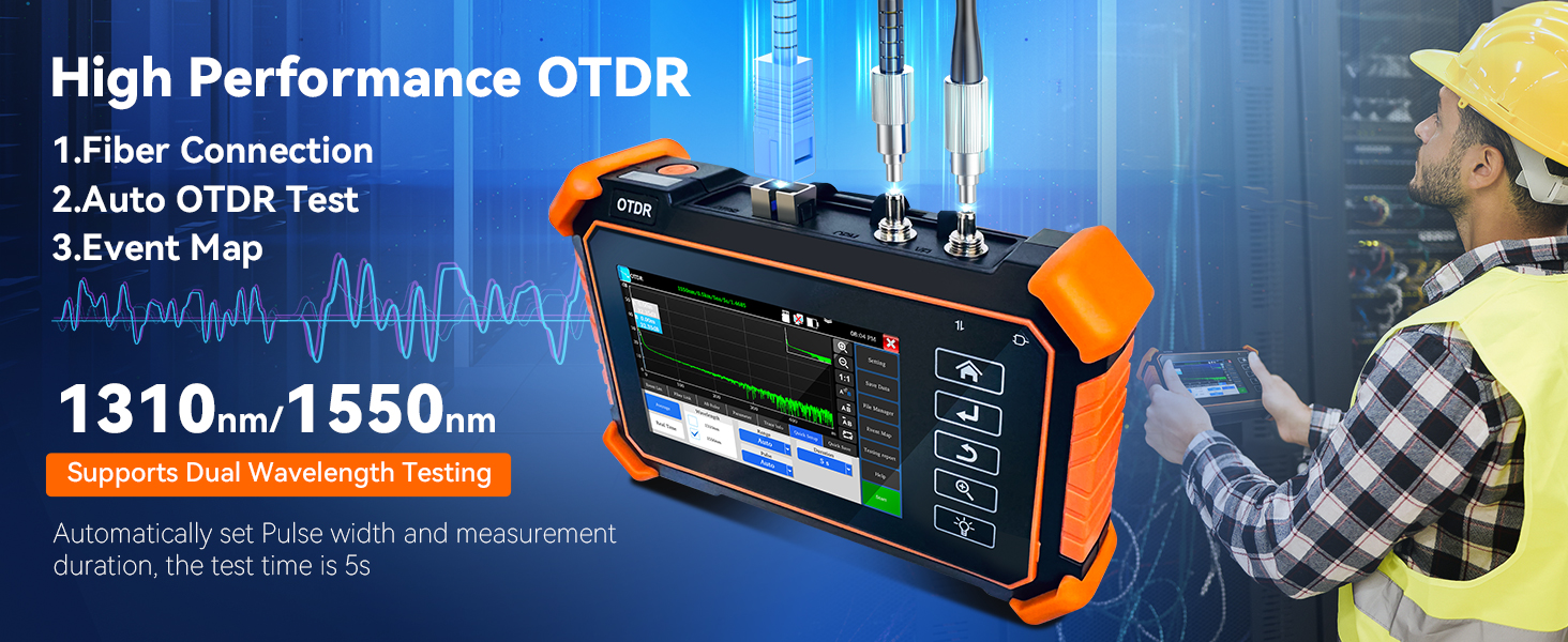 【OTDR Fiber Optic Tester 】OTDR test: wavelength 1310nm/1550nm, dynamic range 26dB/24dB. Quick Setup mode: quickly set wavelength, distance range, pulse width and measurement duration; Parameters Set mode: professional technicians can set the wavelength, distance range, pulse width, measurement mode, IOR, non-reflection threshold, end threshold and other parameters before testing, which will get more accurate curve results