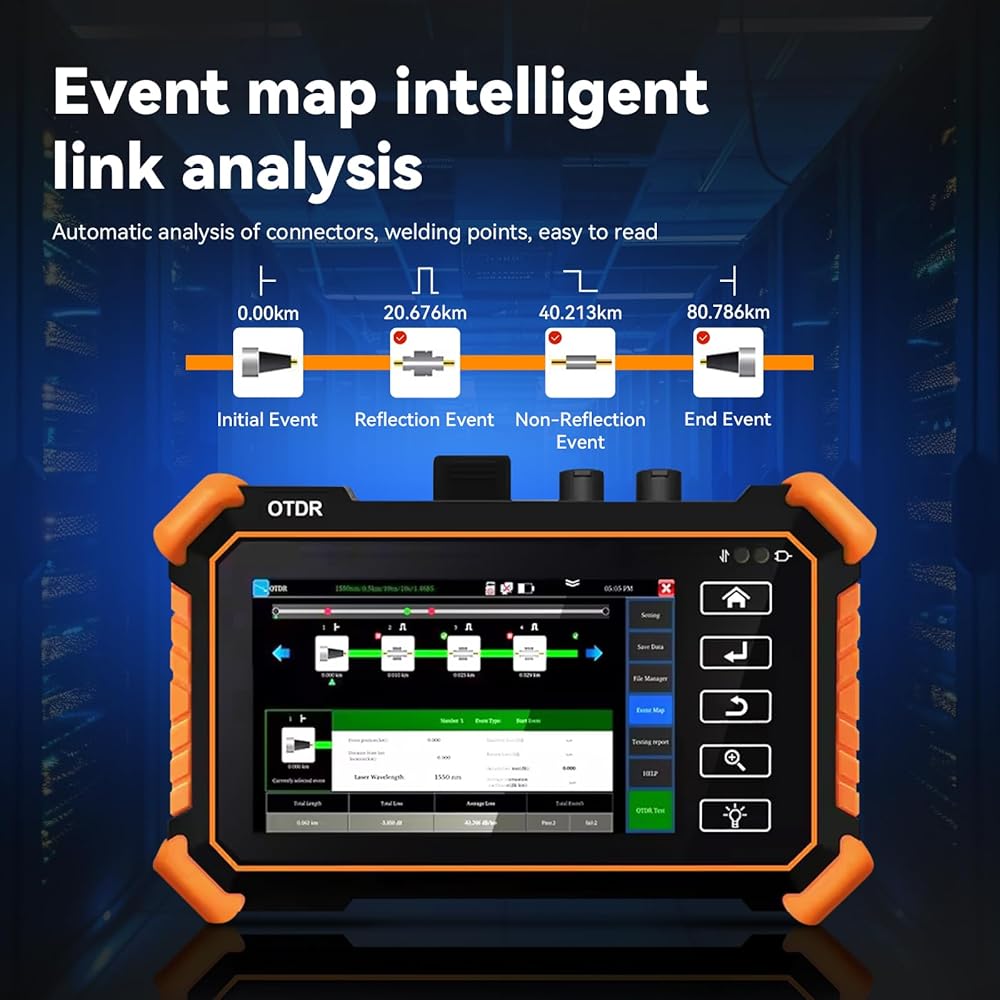 【Event Map & Data Storage】Fiber optic tools can visualize road problems and faults at a glance. Information such as the length of the fibre optic link, type of connector, fusion point or break point is presented in a graphical form that is easier to understand. Save and view the testing curves, support zoom and move curves, view details. (Event Blind Zone <1.6 m, Attenuation Blind Zone<8 m.) OTDR tester support create testing report, including curve trajectory graphs, parameter settings, fiber event information, and fiber link information.