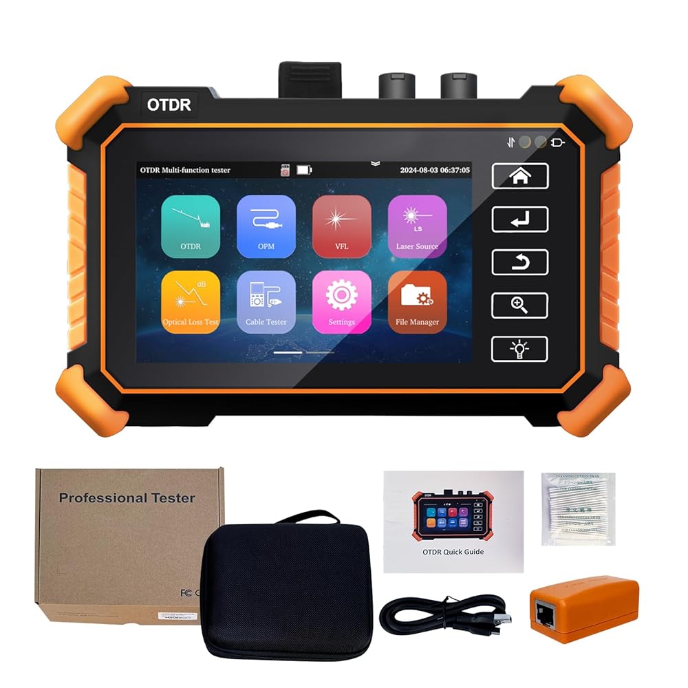 【4 inches Intelligent and Multi-functional Fiber Optic Tester】containing expert OTDR, automatic OTDR, event map, 10G split-wave power meter, general optical power, end state verification, multi-core test, intelligent line diagnosis (optional), loss test, RJ45 line length/line sequence/seeking line, red light, stable light source, illumination. Touch screen and button double design, simple operation, friendly interface, is the optical cable construction installation, engineering acceptance and on-site repair of the right hand.