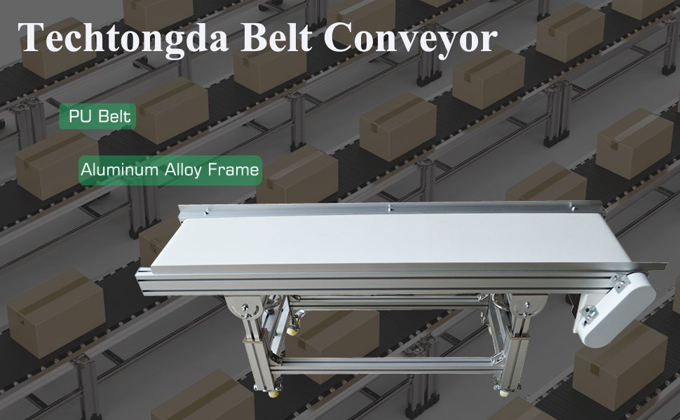 The conveyor consists of aluminum frame, 0.08inch white PU belt, power motor and speed controller. The PU belt is widely used in the transportation industry where food is in contact with belts.