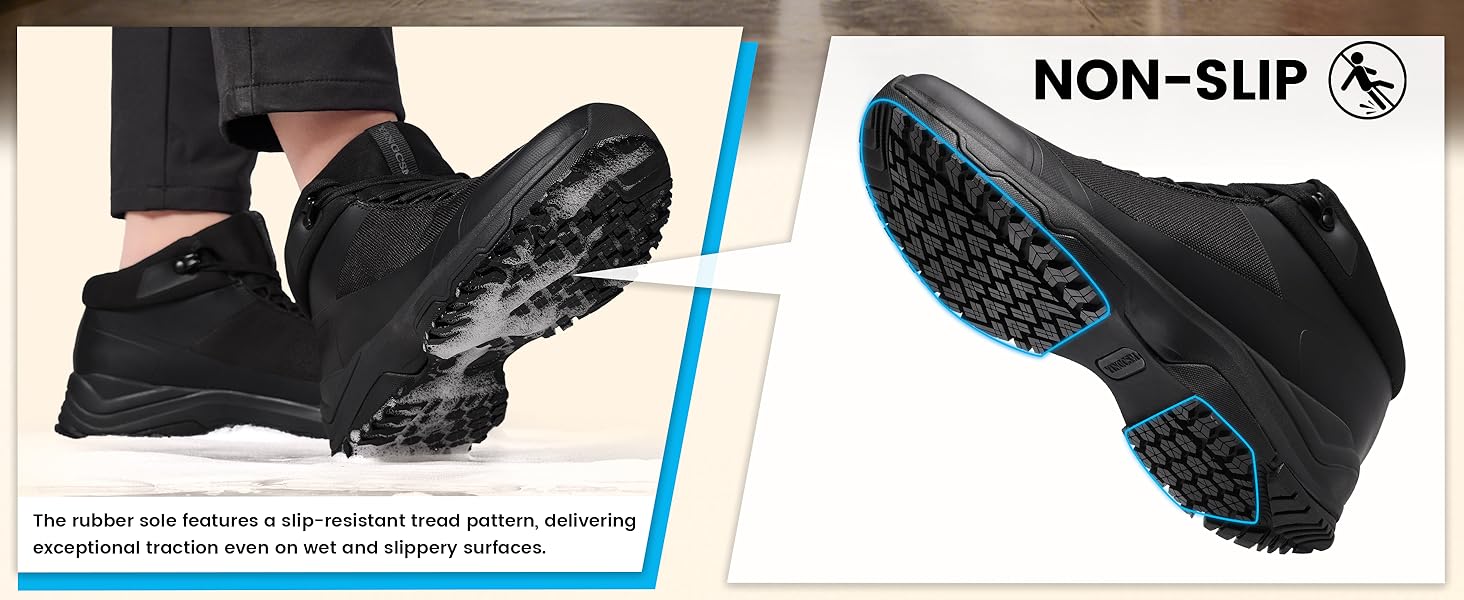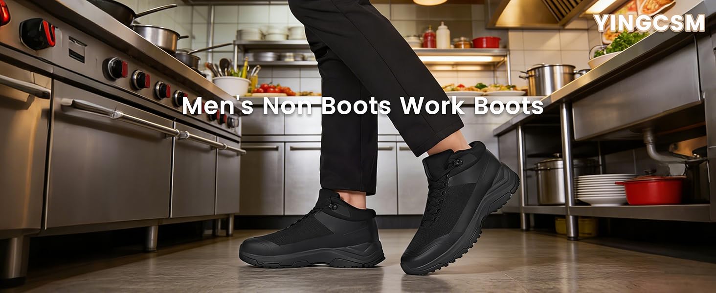 Non-slip Rubber Outsole:Engineered for ultimate stability, our non slip work shoes feature a high-traction rubber outsole with advanced slip-resistant treads. This specialized pattern dramatically enhances grip on wet, oily, and greasy floors, helping to prevent slips and falls in demanding environments like busy kitchens and slick workspaces.