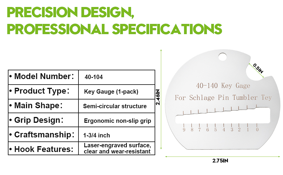 Product Information:Key Gauge products are compact and easy to carry with a semi-circular shape. With your purchase, you will receive a 40-104 for Schlage Key Needle Gauge