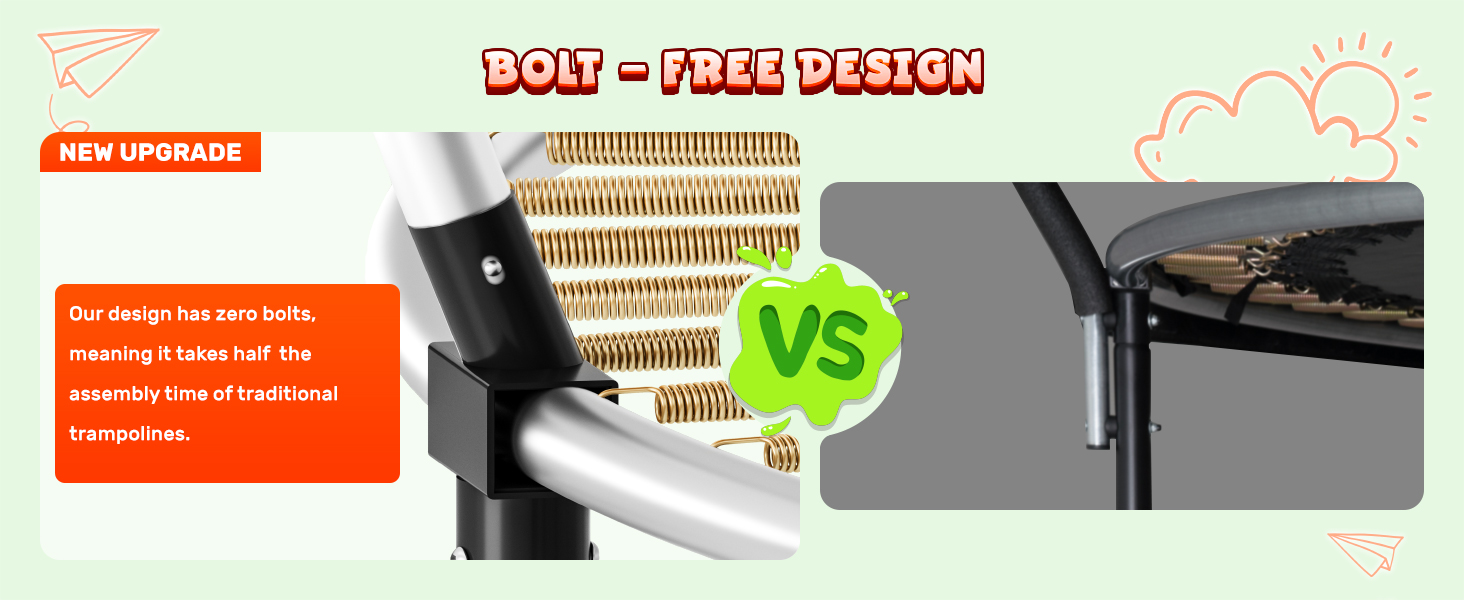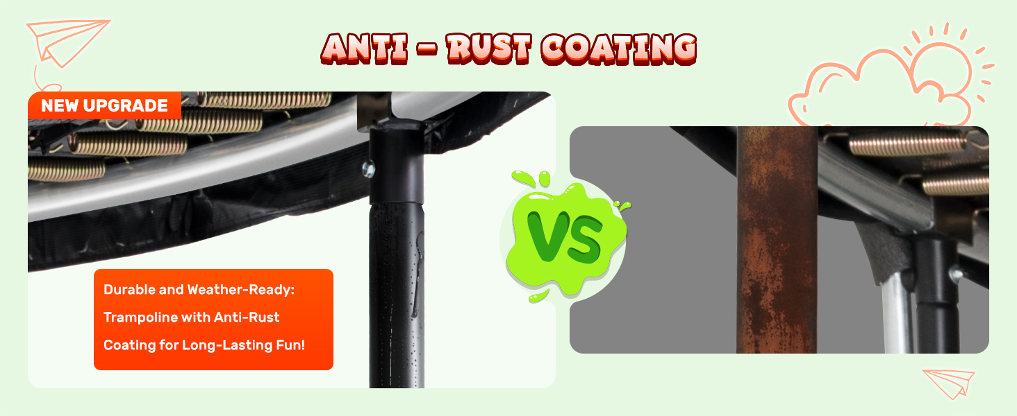 【Built to Last, Fun Never Ends】: Crafted for longevity, our trampoline for kids features a twice-GALVANIZED frame and springs, along with expertly black POWDER-COATED legs, providing exceptional resistance against rust and harsh weather conditions. This ensures that your children can continue to create lasting memories year after year, with endless jumps and smiles.