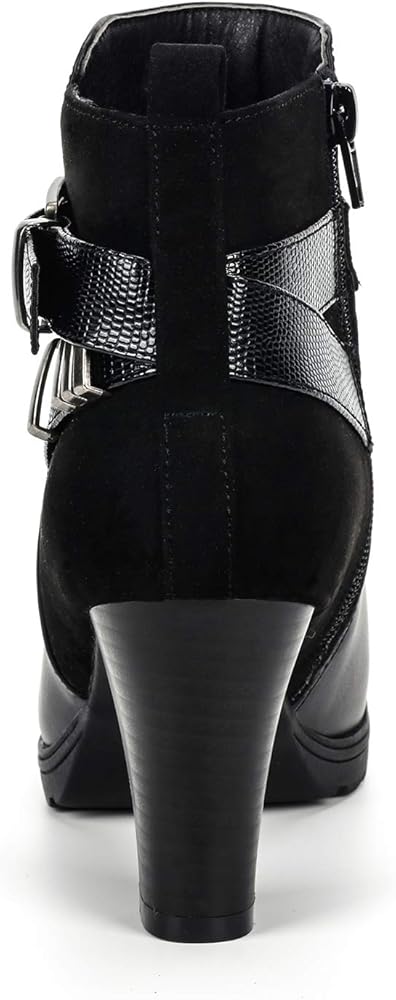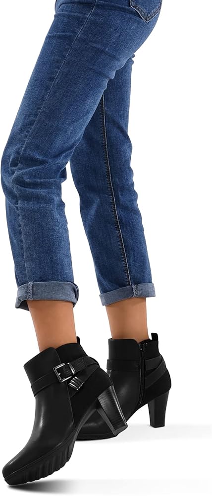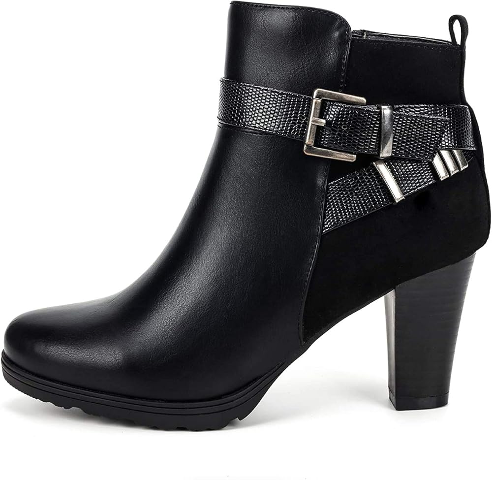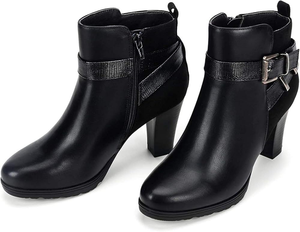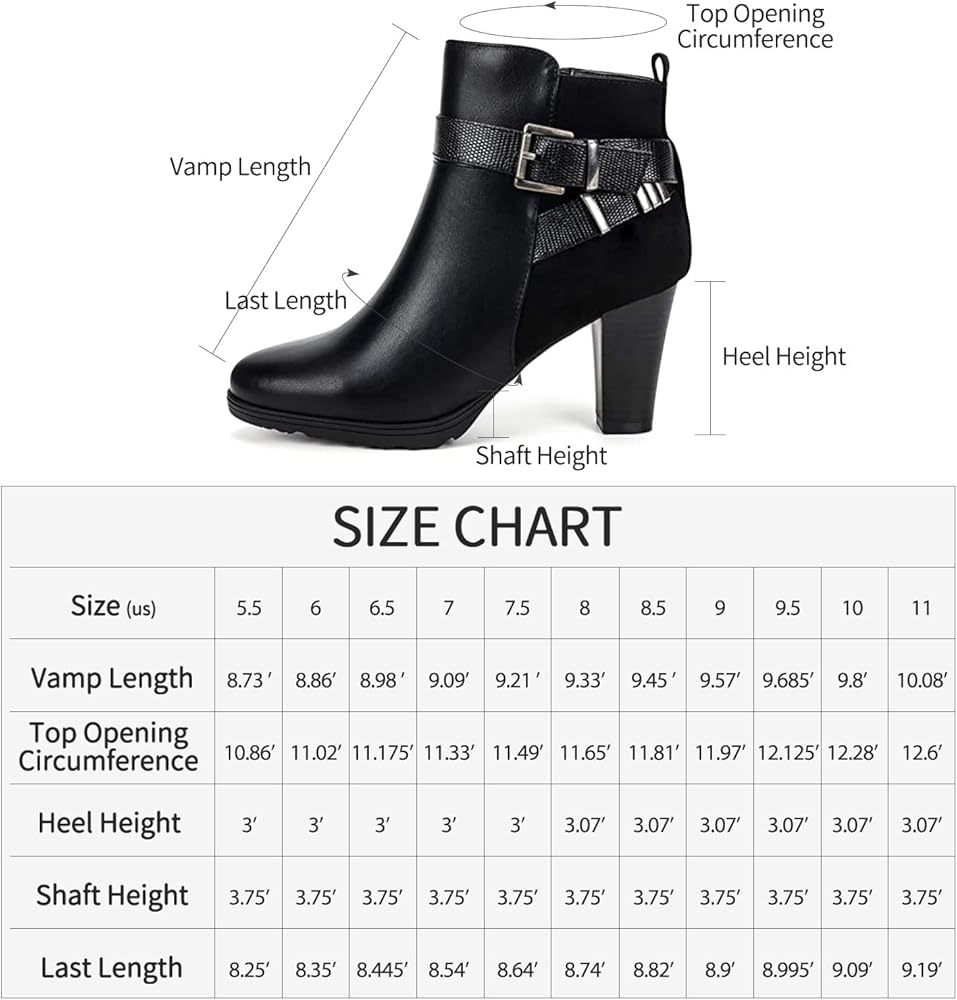 ★★Approx measurements★★ Ankle Boots Heel Height: 3 in; Platform Height: 0.6 in; Detailed data can refer to the picture description. Faux leather upper with extra depth design and round toe box eliminates pressure on toes, walking miles and miles every day while traveling with these booties.