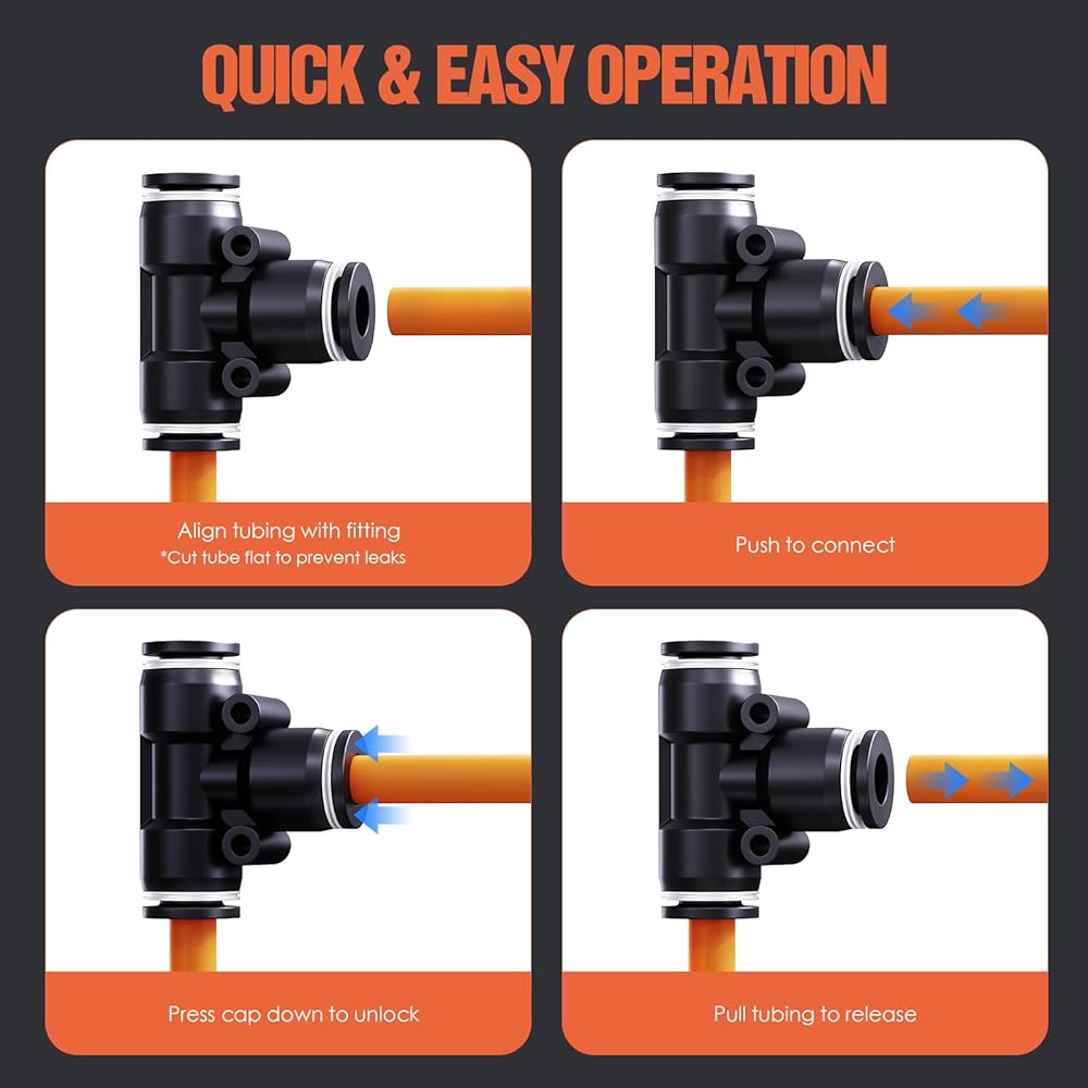 Easy Push-to-Connect Design – Tool-free connection! Just push the tube in to lock securely—press the release ring for quick removal. These quick connect air hose fittings make installation fast and simple.