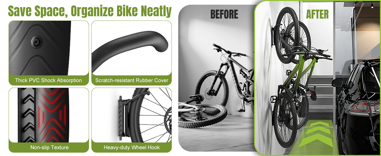 Protective Coatings and Pads: The bike hook features protective coating and rear wheel stop pad that not only protects the integrity of your bike frame, but also prevents scratches and damage to walls. This thoughtful addition gives you peace of mind that your bike and your home are keep original.