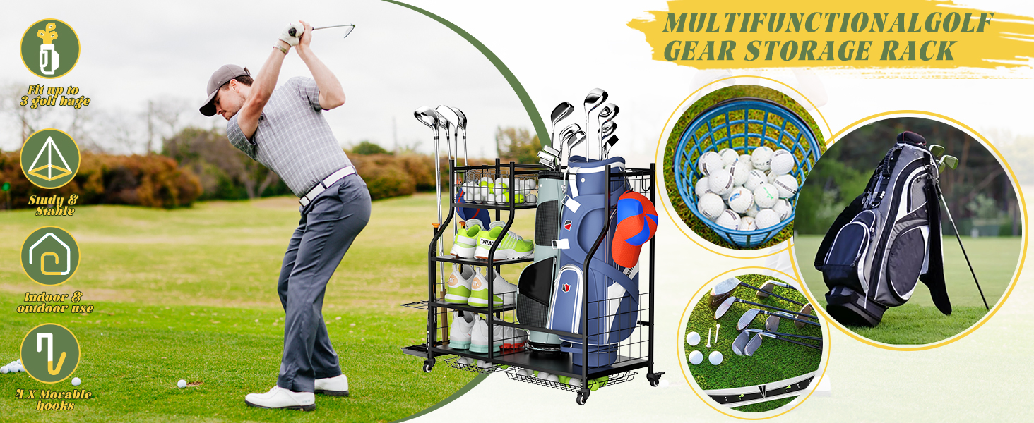 This versatile golf storage collection offers premium solutions for organizing all your golfing essentials. Designed to hold up to 3 golf bags, these organizers feature multiple tiers, upper storage shelves, dedicated golf club racks, and removable hooks for accessories like towels, shoes, and brushes. Customizable configurations, including DIY installation options, allow you to adapt the storage to your space. Sturdy steel construction with soft-edge designs ensures durability and protects your equipment from scratches. Adjustable feet and lockable wheels provide stability and mobility, making these organizers perfect for garages, basements, or golf clubs. With ample capacity, superior functionality, and compact dimensions, these storage solutions are ideal for golf enthusiasts seeking organization and convenience.