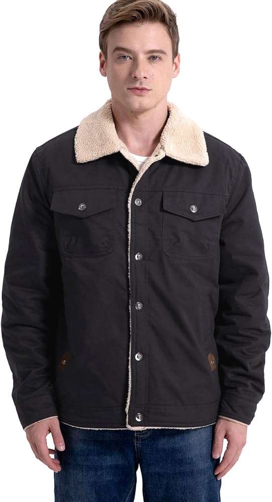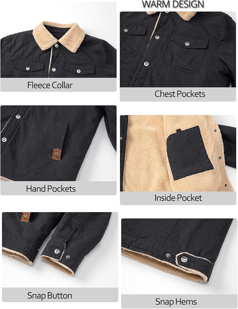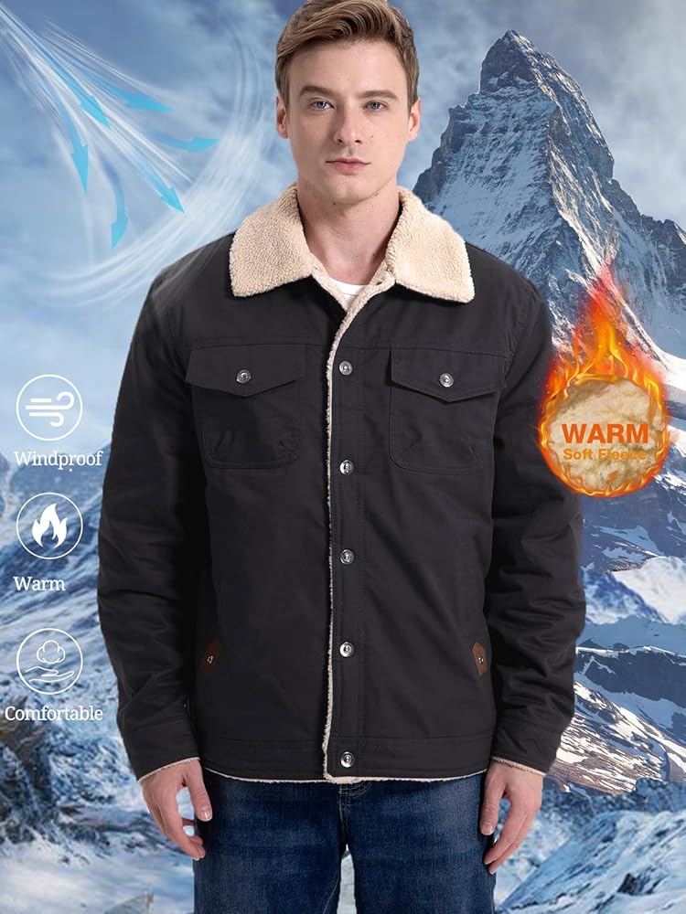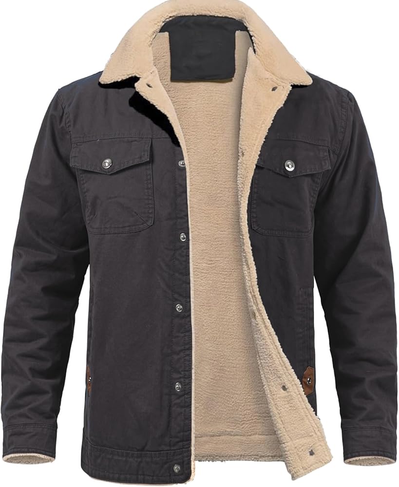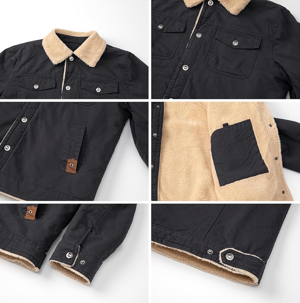 【STYLISH DESIGN】The sherpa lined jacket with fleece turn-down collar to keep added warmth and stylish. Button front closure, adjustable snap-adjustable cuffs and bottom are providing a comfortable fit. Classic style can be paired with jeans,sports pants,casual pants and overalls.