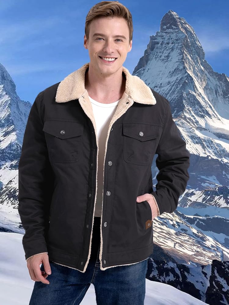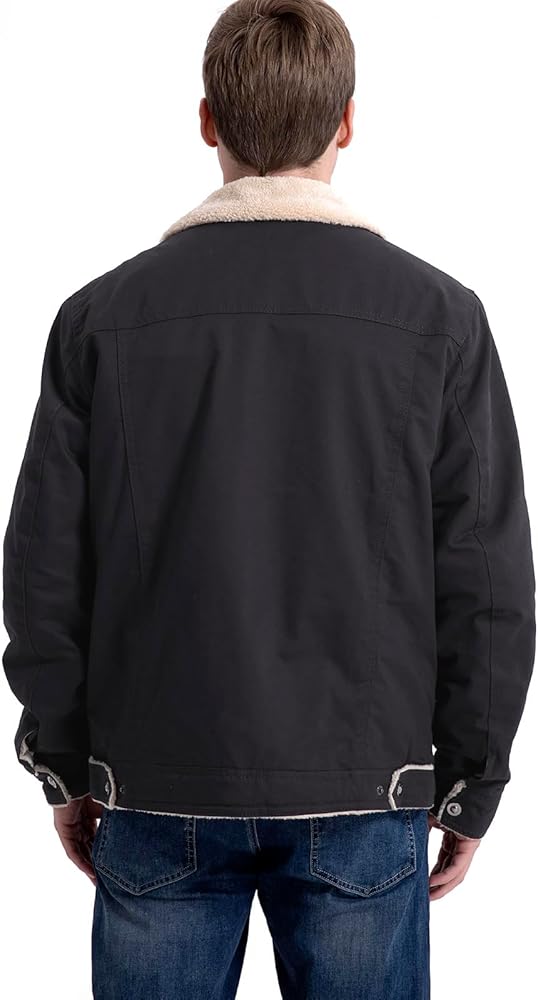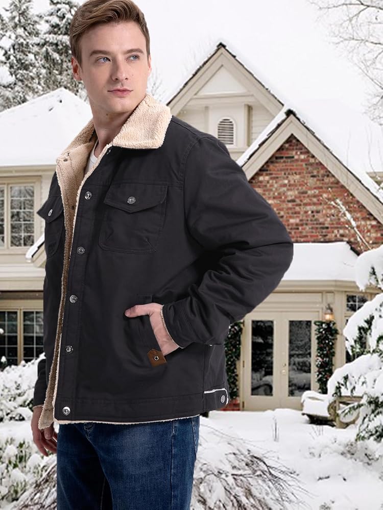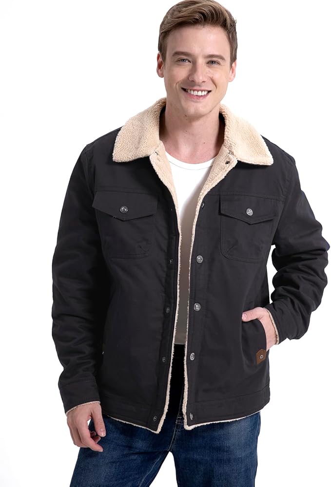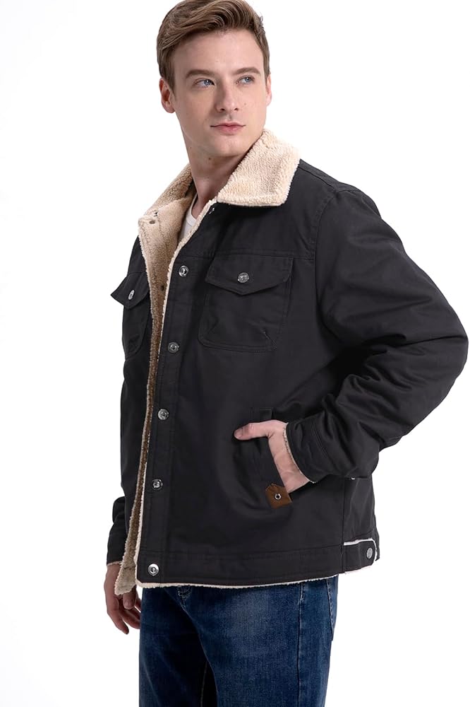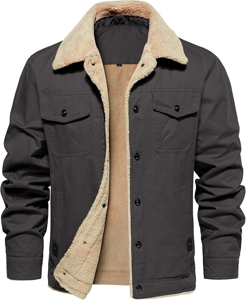 【STYLISH DESIGN】The sherpa lined jacket with fleece turn-down collar to keep added warmth and stylish. Button front closure, adjustable snap-adjustable cuffs and bottom are providing a comfortable fit. Classic style can be paired with jeans,sports pants,casual pants and overalls.