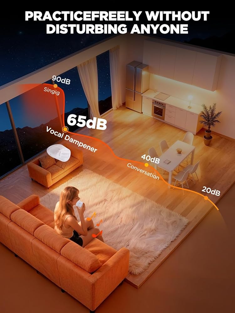 Acoustic Damping Structure for Better Sound Absorption: Featuring a dual-layer acoustic chamber with an integrated damping channel, this vocal dampener reduces sound leakage more effectively than traditional foam mufflers while preserving natural airflow and vocal resonance. It can reduce singing volume from around 90dB to 65dB, with a max reduction of 25dB (depending on the environment), allowing you to train at night