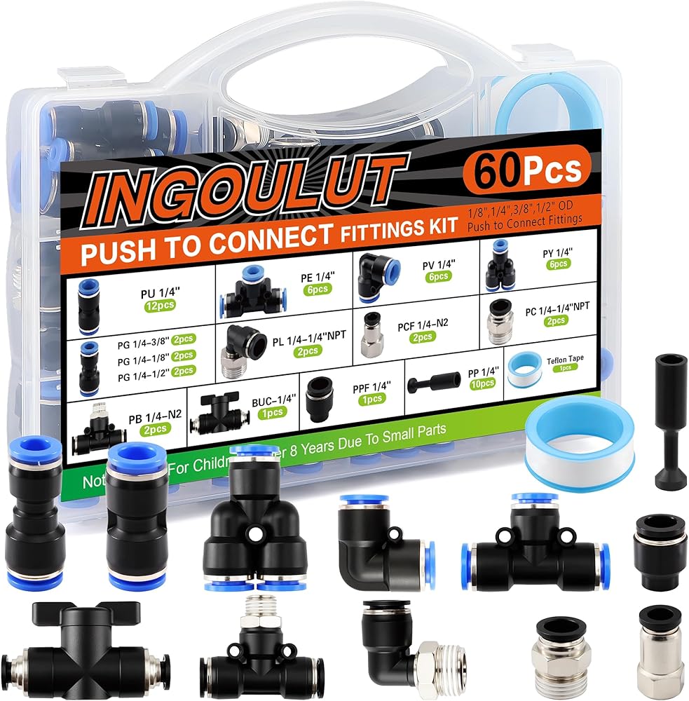 60 PCS Push to Connect Fittings 1/4 Inch Assortment Kit OD 1/4" Tube to 1/4" 1/2" 3/8" 1/8" NPT Thread Air Hose Quick Connect Fitting Air Line Fittings Quick Release Fitting