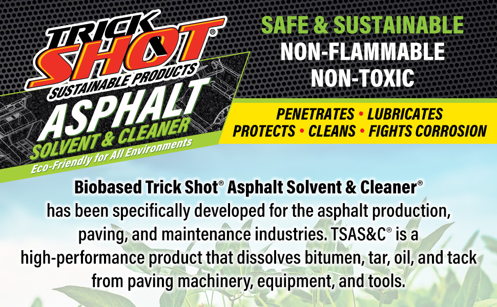 MULTI-SURFACE CLEANING SOLUTION: Removes asphalt from construction equipment, paving tools, vehicle fenders, and truck beds. Functions as a concrete release agent to prevent asphalt adhesion during paving. Safe on equipment and machinery. Works as a tack cleaner and asphalt sealer preparation solution.