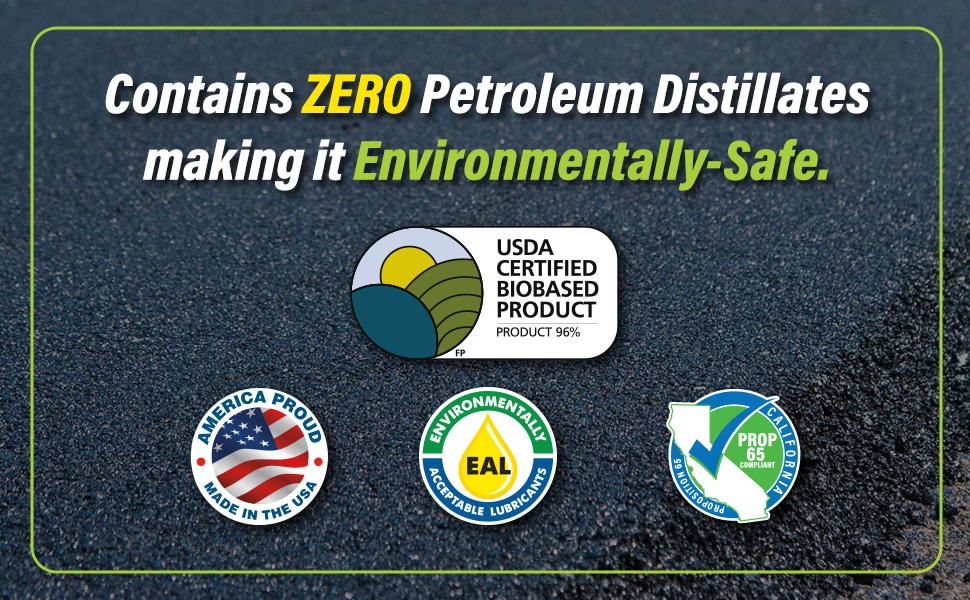 BIOBASED FORMULA COMPOSITION: USDA BioPreferred asphalt cleaner with 96% bio-based content and food-grade formulation. Contains zero petroleum distillates with near-zero VOCs. This non-flammable degreaser spray is NSF-H1 registered. Biodegradable alternative.