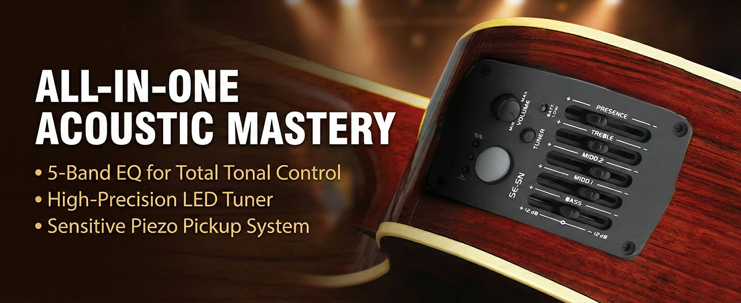 BUILT-IN CHROMATIC LED TUNER: Stay perfectly in tune anytime, anywhere. The integrated digital tuner features a bright, easy-to-read LED display that works well even on dark stages. It provides accurate note detection with signal lights, allowing for quick, silent tuning adjustments between songs without external pedals.