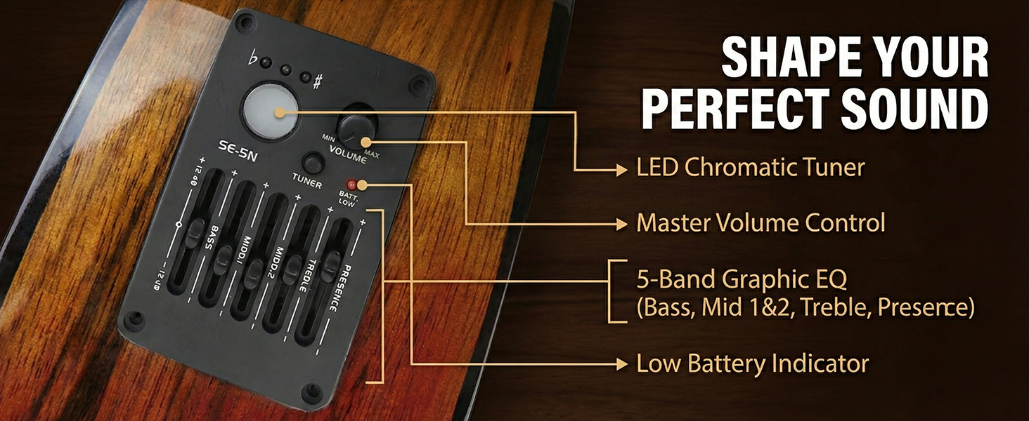 ULTIMATE 5-BAND TONE SHAPING: Take full control of your acoustic sound with five adjustable frequency sliders: Bass, Middle 1, Middle 2, Treble, and Presence. Unlike standard 3-band EQs, the dual middle-range controls (Midd.1 & Midd.2) allow for precise tone sculpting, ensuring your guitar cuts through the mix with clarity, whether you are playing rhythm or lead.