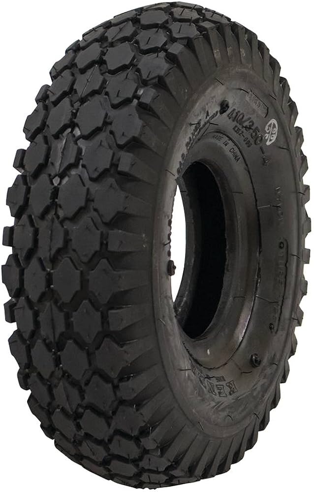 Specs: tread: stud. Tire size: 4.10x3. 50-4. Ply: 2. Max psi: 30. Max load capacity: 260. Type: Tube type. Rim size: 4". Multi-purpose tread for maximum traction. Puncture resistant for durability. Strong carcass designed to support the weight of lawn equipment