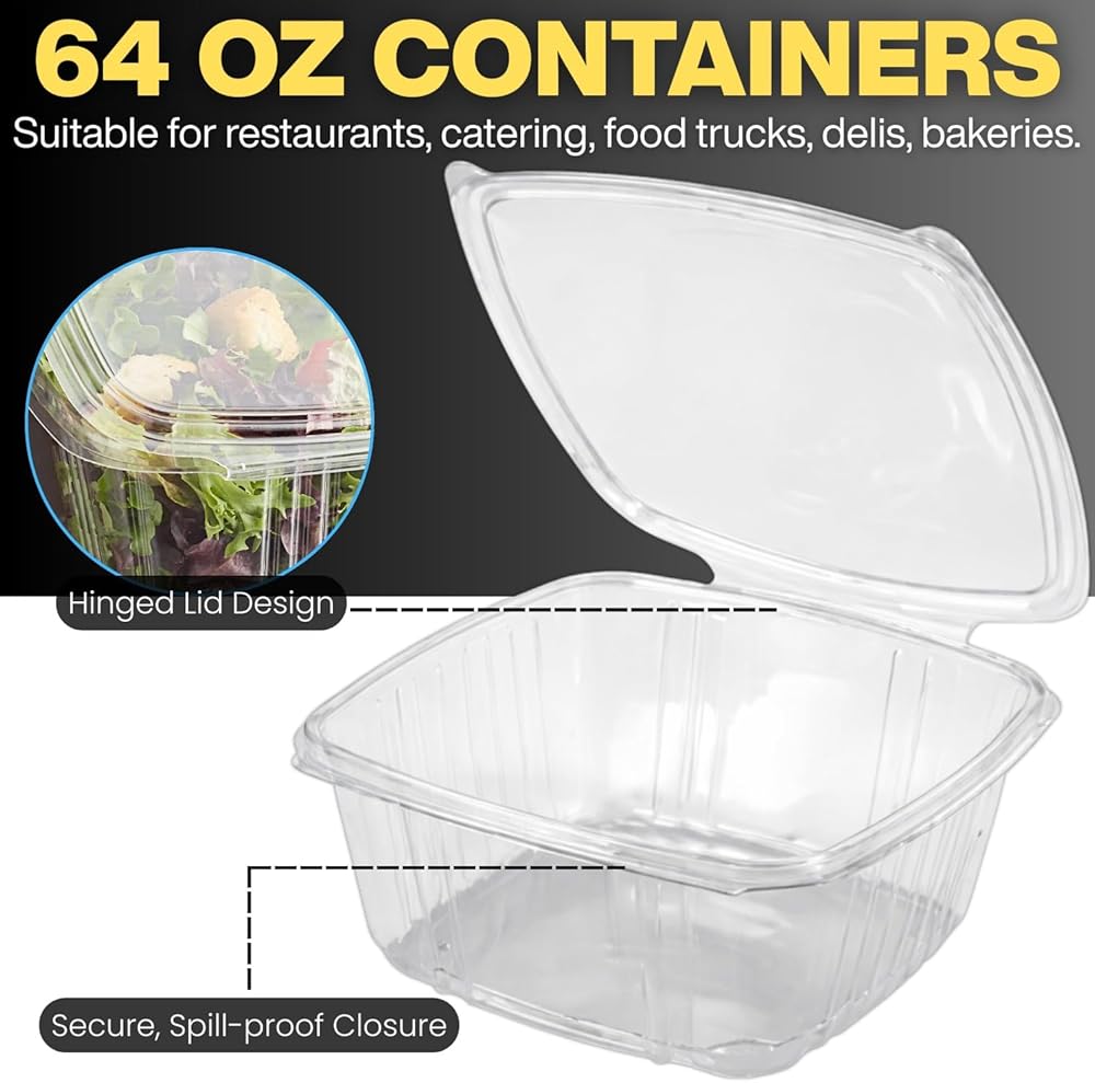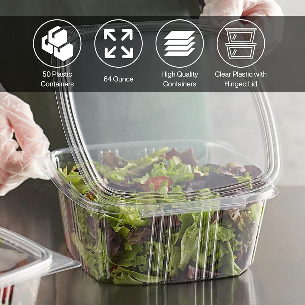 Discover convenient food storage with these premium 64-ounce Smygoods deli containers. The set includes 50 crystal-clear PET plastic containers featuring practical hinged lids that eliminate the hassle of mismatched containers and tops. The secure clamshell design ensures reliable closure, while the transparent construction allows for easy content identification. These rectangular containers are perfect for restaurants, delis, food trucks, or home meal prep, offering generous space for salads, pasta dishes, sandwiches, and more. The stackable design maximizes storage efficiency, making them ideal for commercial kitchens and home organization. Microwave-safe and leak-resistant, these containers are suitable for hot foods and reliable food storage. The lightweight yet durable construction ensures convenient handling, while the bulk pack of 50 pieces provides excellent value for both business and household use. Ideal for take-out orders, food delivery, picnics, parties, and organizing leftovers. Hand washing recommended for best results.