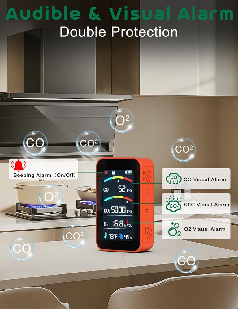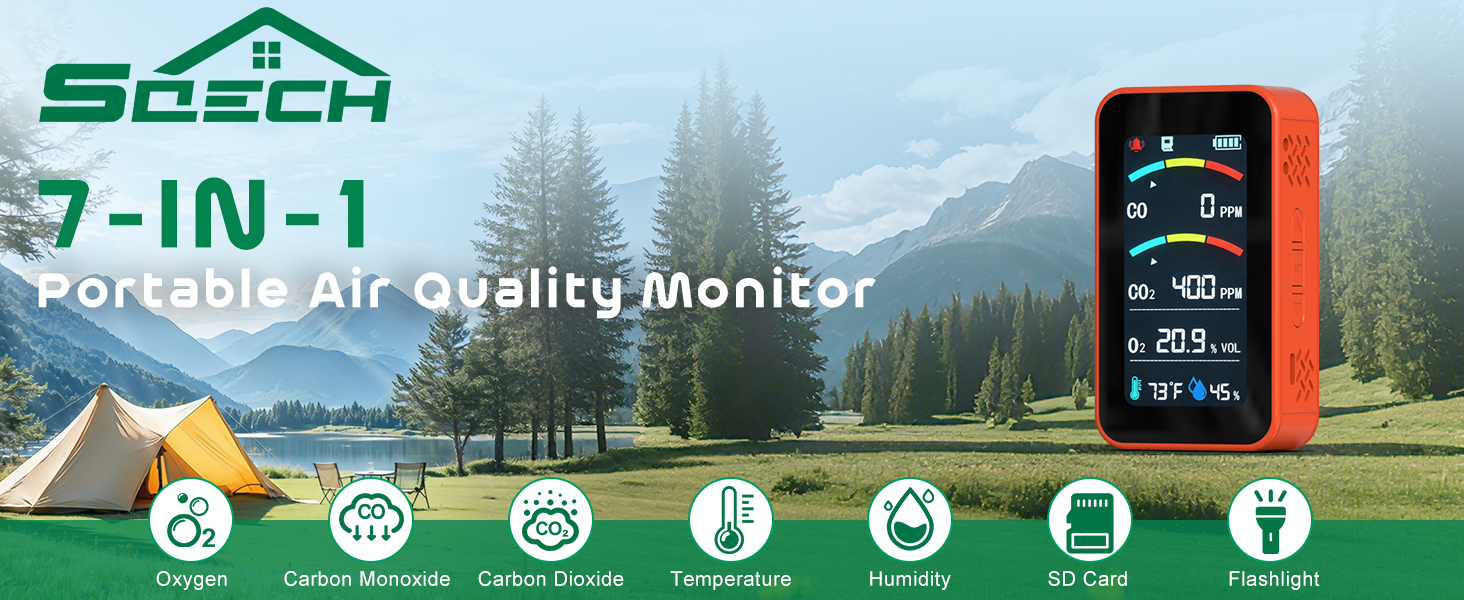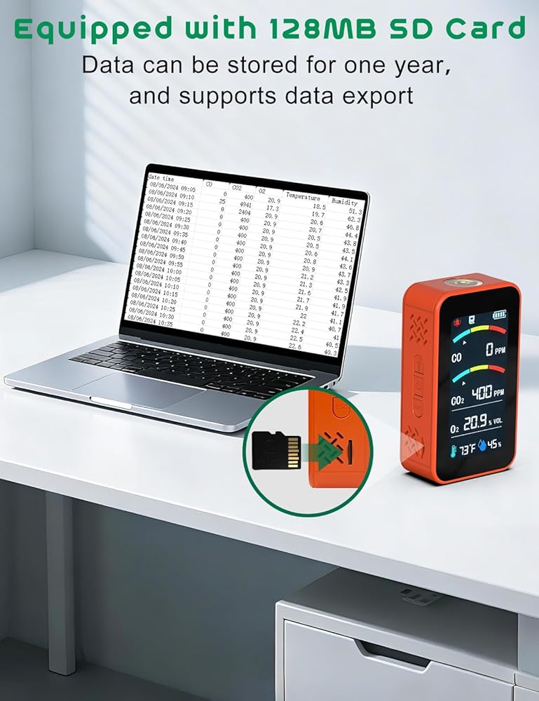 【7-in-1 Air Oxygen Monitor】This 7-in-1 multi-functional oxygen detector can detect multiple parameters in real time: CO (0-500PPM), CO2 (400-5000PPM), O2 (0-30%VOL), temperature (32℉-140℉), and humidity (0-95%RH). The rechargeable oxygen monitor also features a flashlight, SD card data storage, and a convenient lanyard, making it not only suitable for indoor air quality monitoring but also an ideal travel companion.