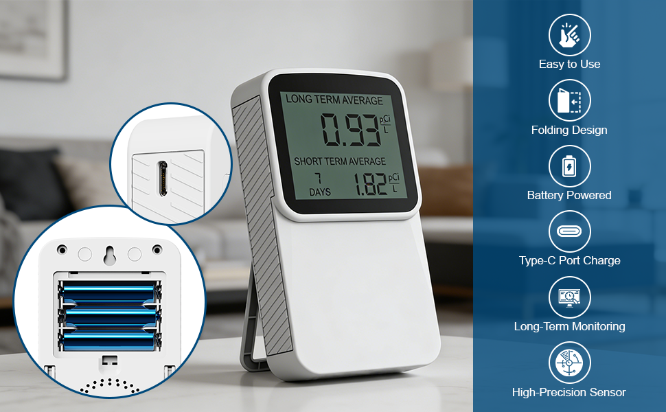 【Portable Radon Detector】 The folding stand can be used to place the unit securely on a flat surface. The folding stand is easy to store and convenient to carry.The large display ensures that the user can clearly read the measured values from all angles.