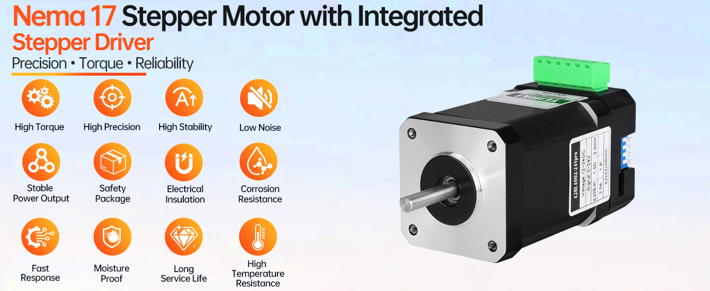 Characteristics: Nema 17 Stepper Motor with built-in driver, 2 Phase, Step angle 1.8 Degree(200 steps/rev), Holding torque 0.41Nm (58.06oz·in), Resistance 2.0Ω, Rated current 1.5A, Rotor inertia approx 60g.cm², Inductance 3.8mH±20%.