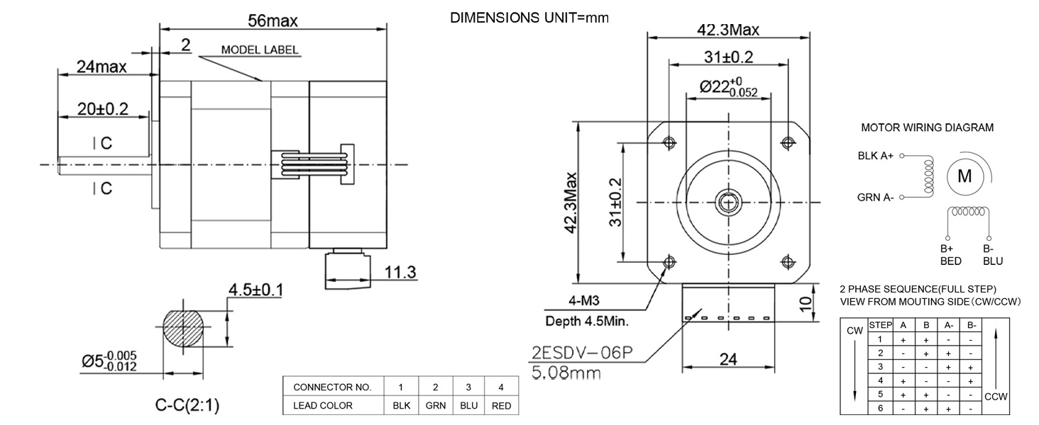 Size Specifications: Nema 17 stepper motor with integrated stepper controller dimensional parameters are as follows. Body size 42x42x56mm (1.66x1.66x2.21in), Shaft length 24mm, Shaft diameter φ5mm, D-cut length 20mm, Installation hole distance 31mm, Lead color Black (A+) Green (A-) Red (B+) Blue (B-), Weight 302g.