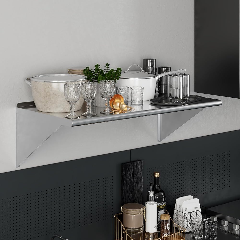 Stainless steel wall shelves are commonly used for food prep in a commercial kitchen, and in many other residential, commercial and industrial applications.