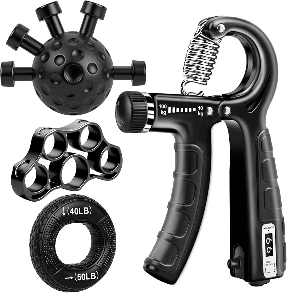 【MULTI-RESISTANCE FOR EVERY SKILL LEVEL】 Adjustable Forearm Strengthener: 22-220 lbs (10-100 kg) resistance dial (beginners to pros). Hand Grip Strengthener Ball: Textured, 20-40 lbs progressive squeeze for endurance. Grip Rings: 40-50LB resistance; food-grade silicone, non-slip, durable. Finger Stretcher: 8.8 LB; break-resistant bands, ergonomic fit for all-day use.