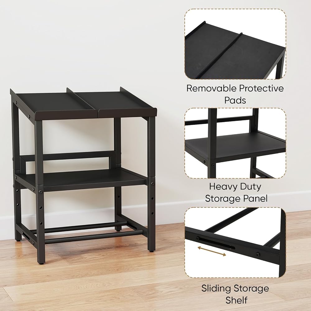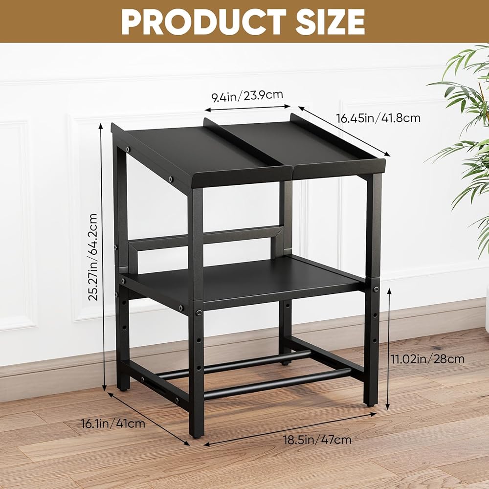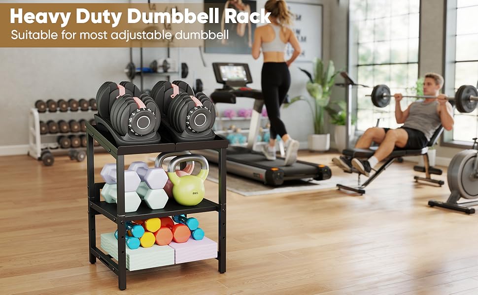 3 TIER DUMBBELL RACK: The overall size of this adjustable dumbbell stand is 16.1 * 18.5 * 25.3 inches; The top tray is suitable for most adjustable dumbbells (length ≤ 16.4 inches, width ≤ 9.4 inches); The height of the middle partition can be adjusted to store dumbbells of different sizes; The spacing between the bottom support rods can also be adjusted by sliding. The large capacity design can meet the storage needs of commercial gyms and home fitness enthusiasts