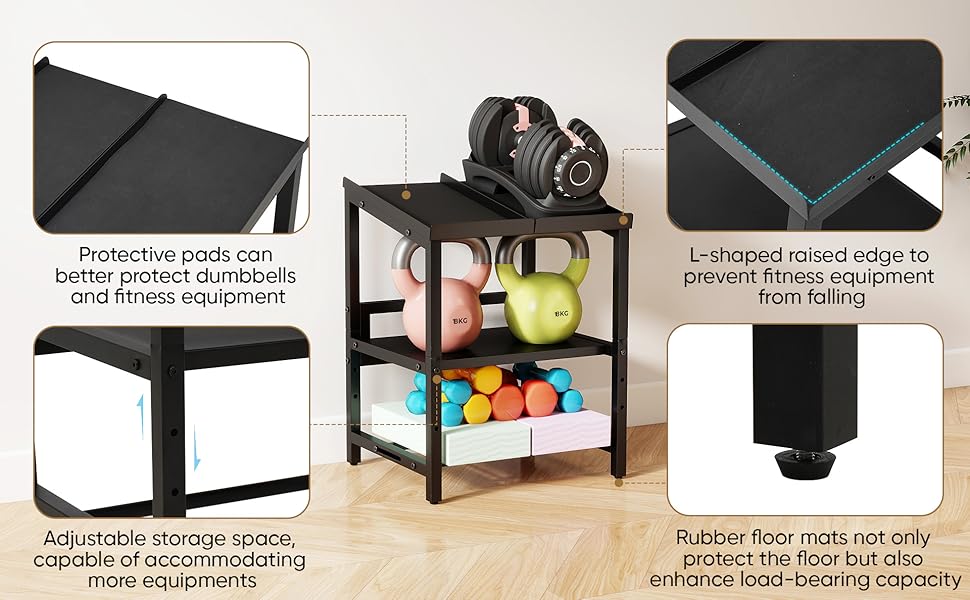 SPACE SAVING DESIGN: This dumbbells holder stand features a compact 3 tier design that can accommodate different fitness space layouts. It can store dumbbells, kettlebells, and fitness mat brick, effectively saving space and keeping your exercise space organized. Equipped with installation instructions and tools, easy to assemble
