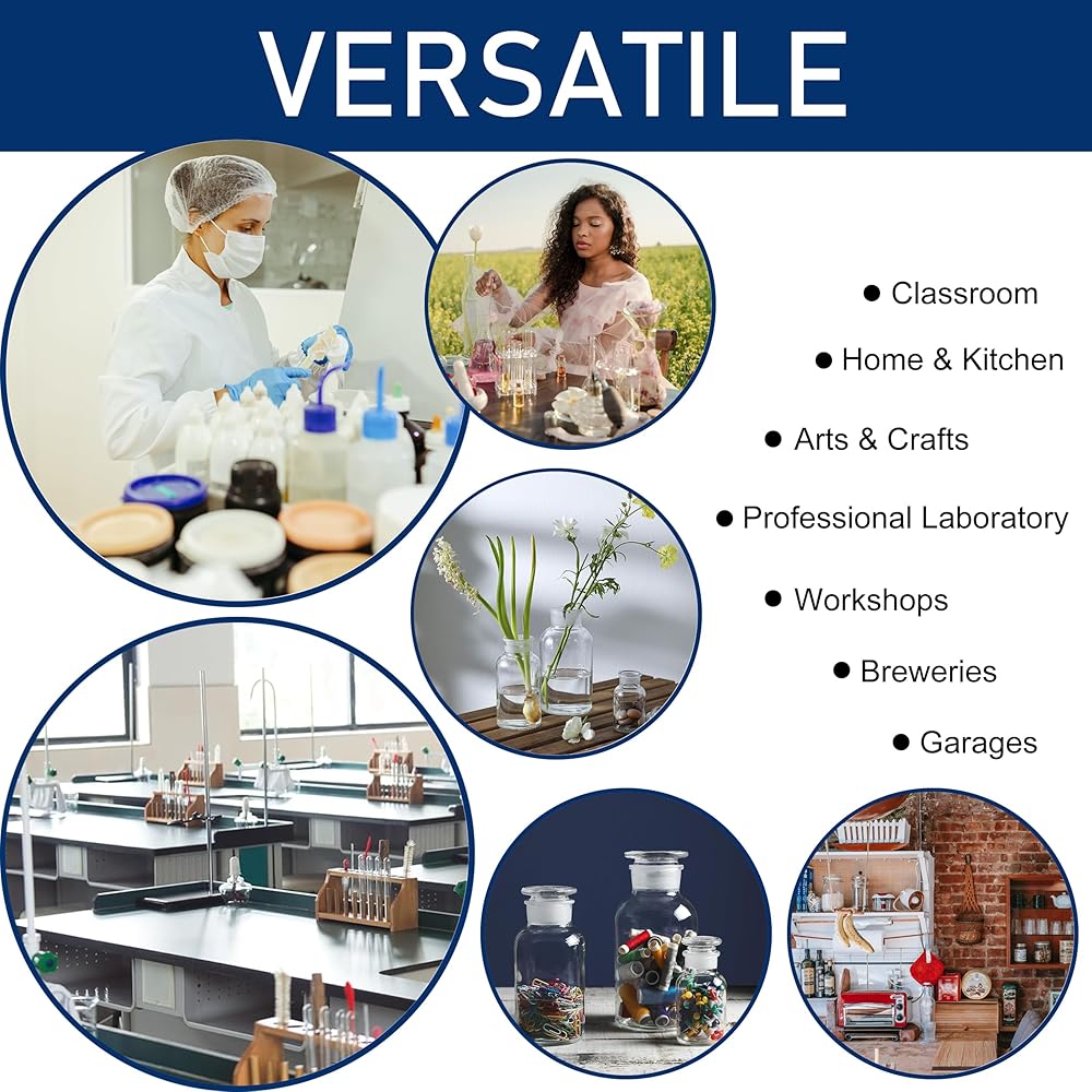 Premium Material Construction: Bottle is made from durable borosilicate glass featuring wide mouth design and ground glass stopper for secure sealing