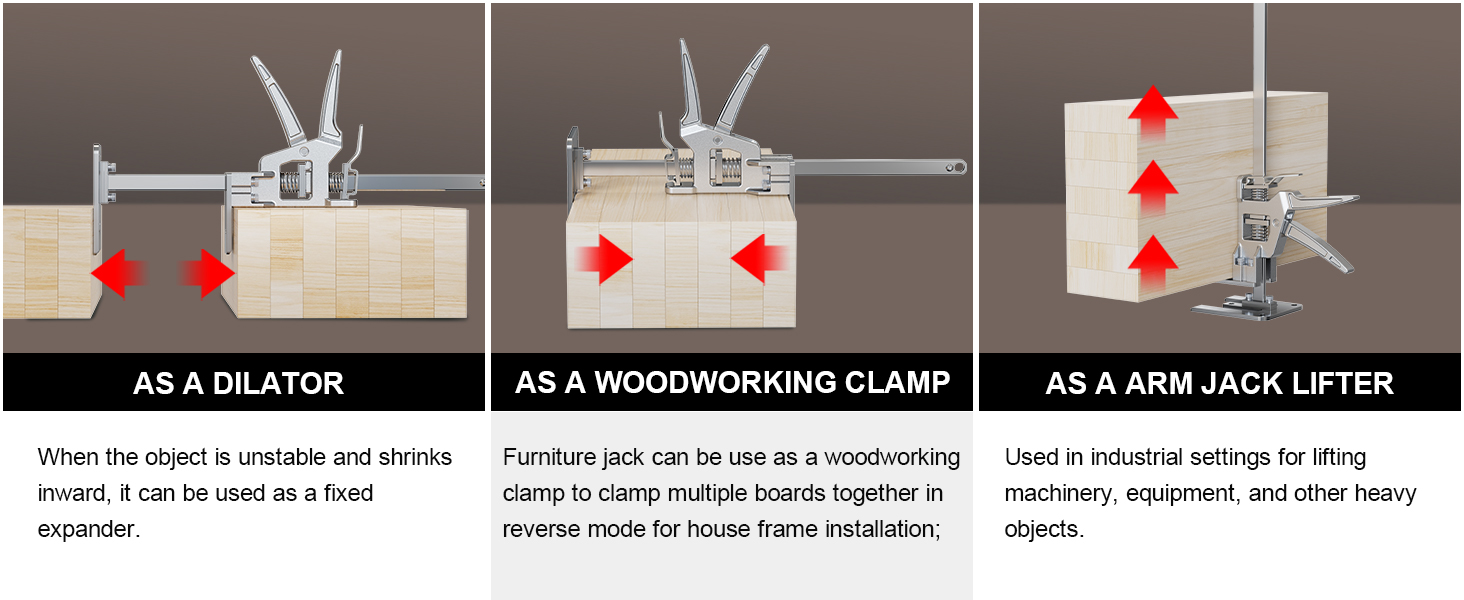 UNIQUE FEATURE: Labor saving arm jack can be used as a beam upper device to clamp beams, and it can be used as a woodworking clamp to clamp multiple boards together; when the object is unstable and shrinks inward, it can be used as a fixed expander