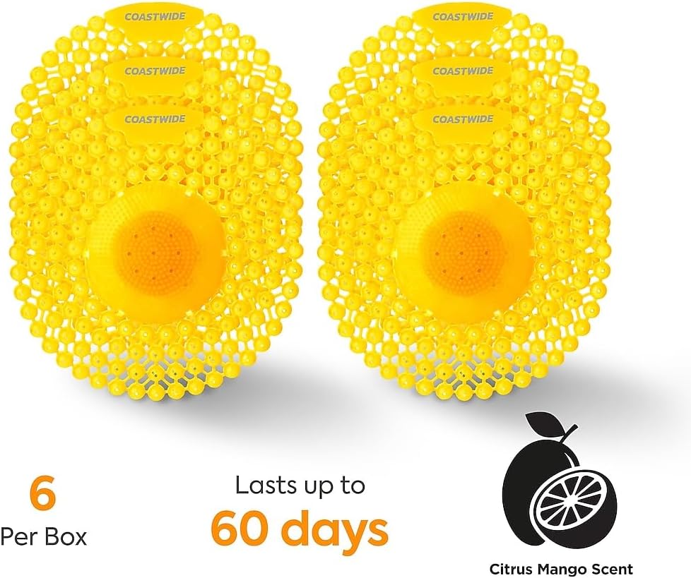 Maintain a fresh-smelling bathroom with these deodorizing Coastwide Professional 60-Day Urinal Screens with continuously evolving fragrance that combats fragrance fatigue. Keep bathrooms and urinals smelling fresh with premium urinal screens that release a tropical citrus scent. These long-lasting Coastwide Professional Urinal Screens work for up to 60 days. The scented, deodorizing materials effectively remove odors while the non-slip finish reduces splashing. With a convenient 6-pack and a design that fits almost any type of urinal, it's easy to stock up for any commercial building or office.