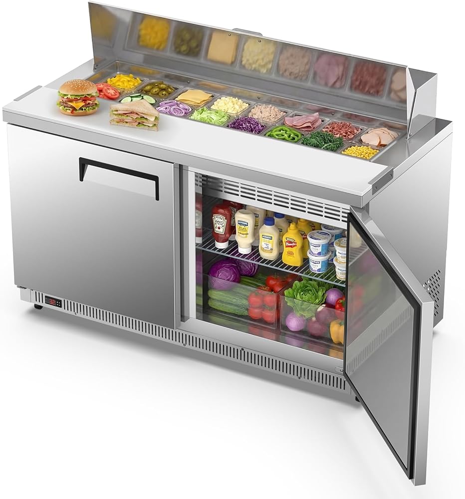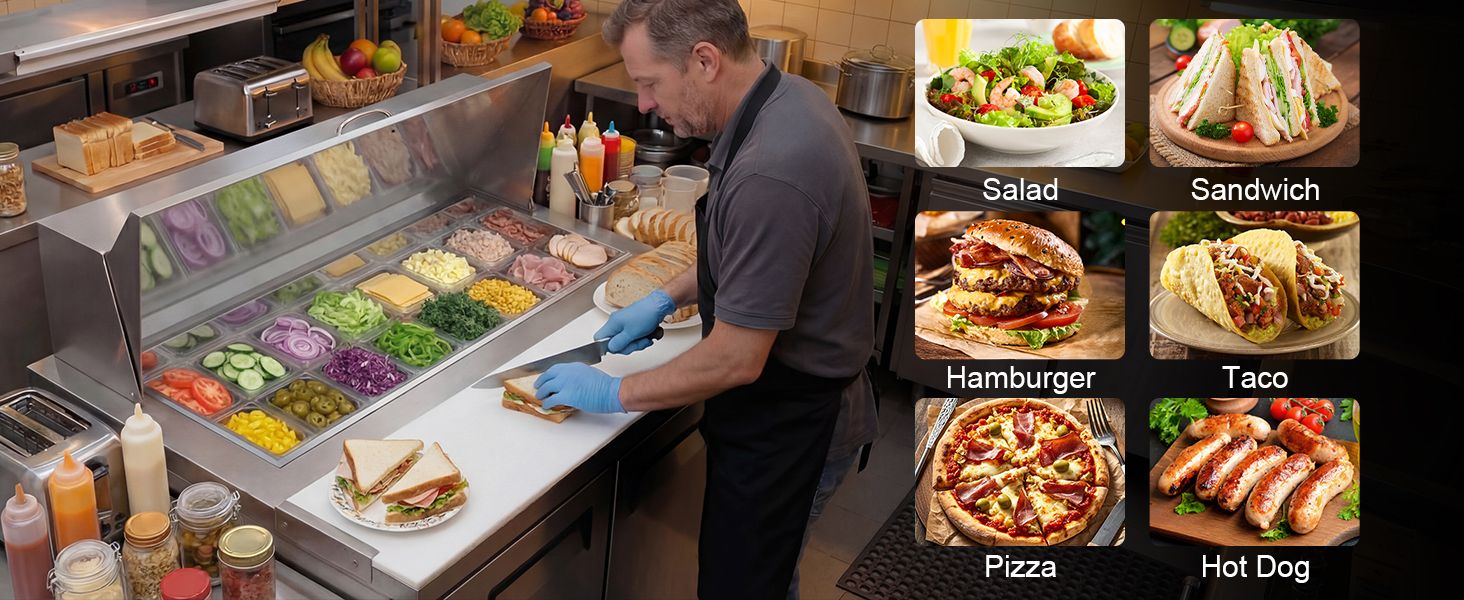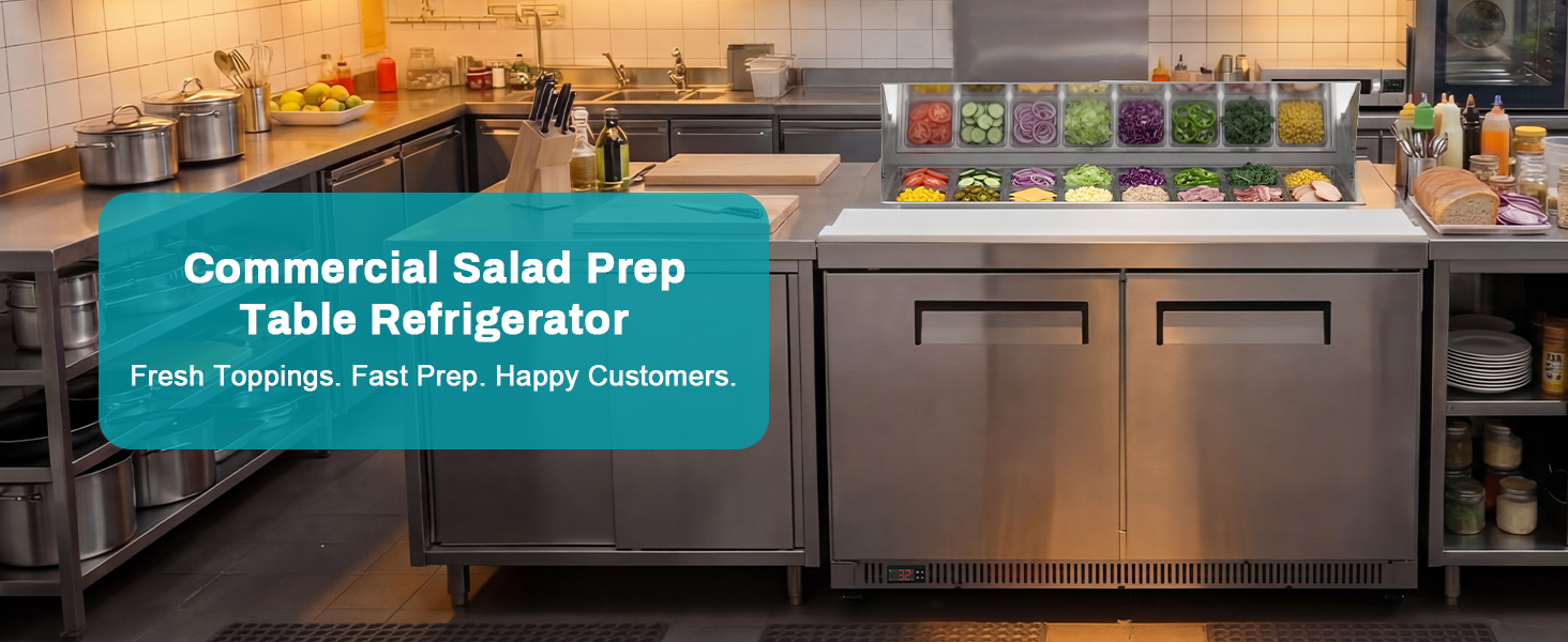 No-Frost Cooling & Precise Digital Temperature Control: Keep ingredients fresher longer with the no-frost commercial refrigerator system that prevents ice buildup and ensures consistent cooling. The LCD digital temperature control allows precise adjustments from 32°F to 50°F, maintaining the ideal environment for toppings and fresh produce. Whether used as a salad prep table or sandwich prep fridge, this unit delivers reliable temperature stability for busy restaurant, food truck, and catering operations.