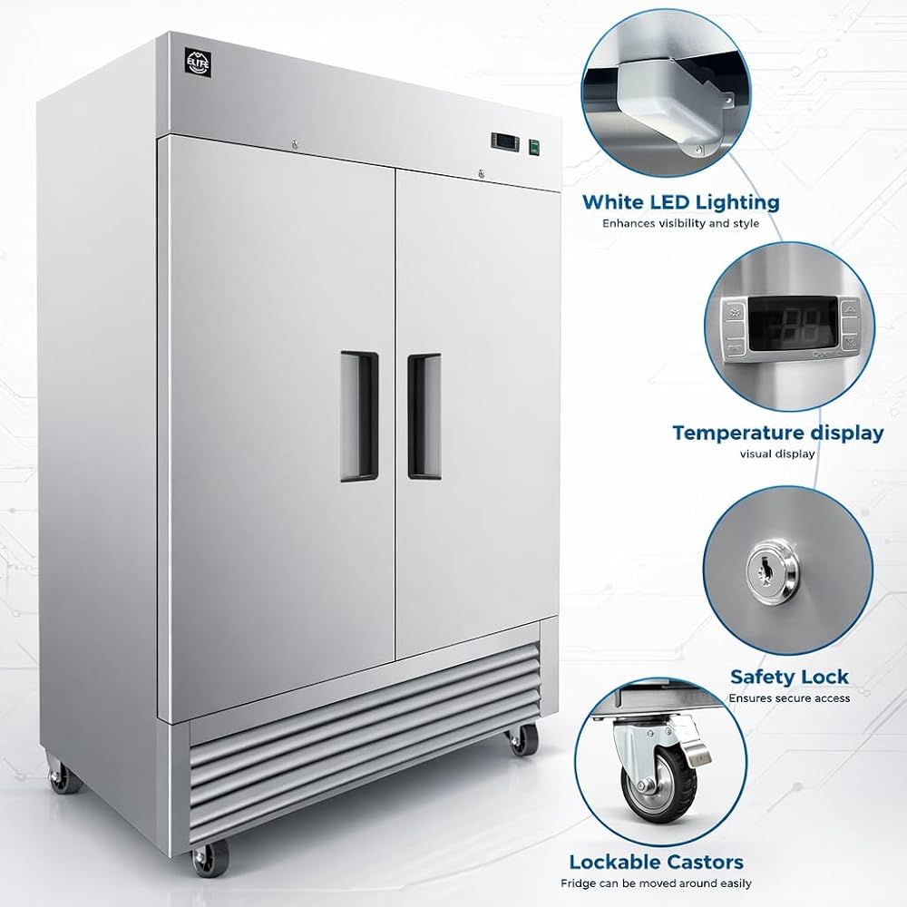 This NSF Certified Commercial Reach-In refrigerator has spacious dimensions of 54"X32"X82", Its capacity is 43 Cu.ft. Crafted with high quality 430 and 304 Stainless steel, this item will keep all your kitchen ingredients cooler and fresher. The led lights included will help you keep track of inventory.