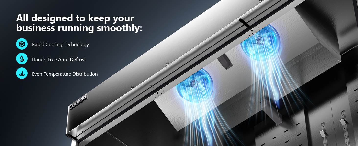 [Smart User-Centric Design] Three doors smoothly self-close from any position within 90 degrees to preserve temperature. When fully opened beyond 90 degrees, a secure hold-open mechanism takes over, freeing your hands to load, clean, or organize without struggling with the doors. Inside, bright LED lighting and 12 adjustable shelves provide flexibility to organize diverse products, streamlining your entire operation.
