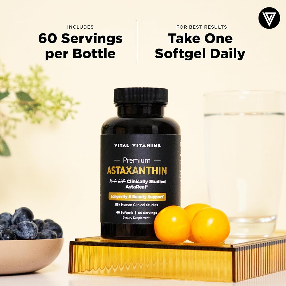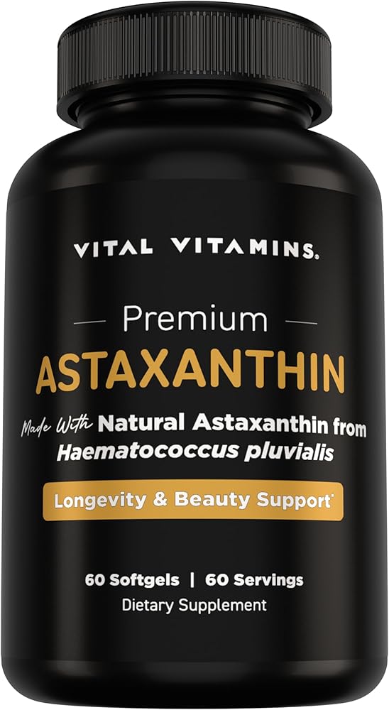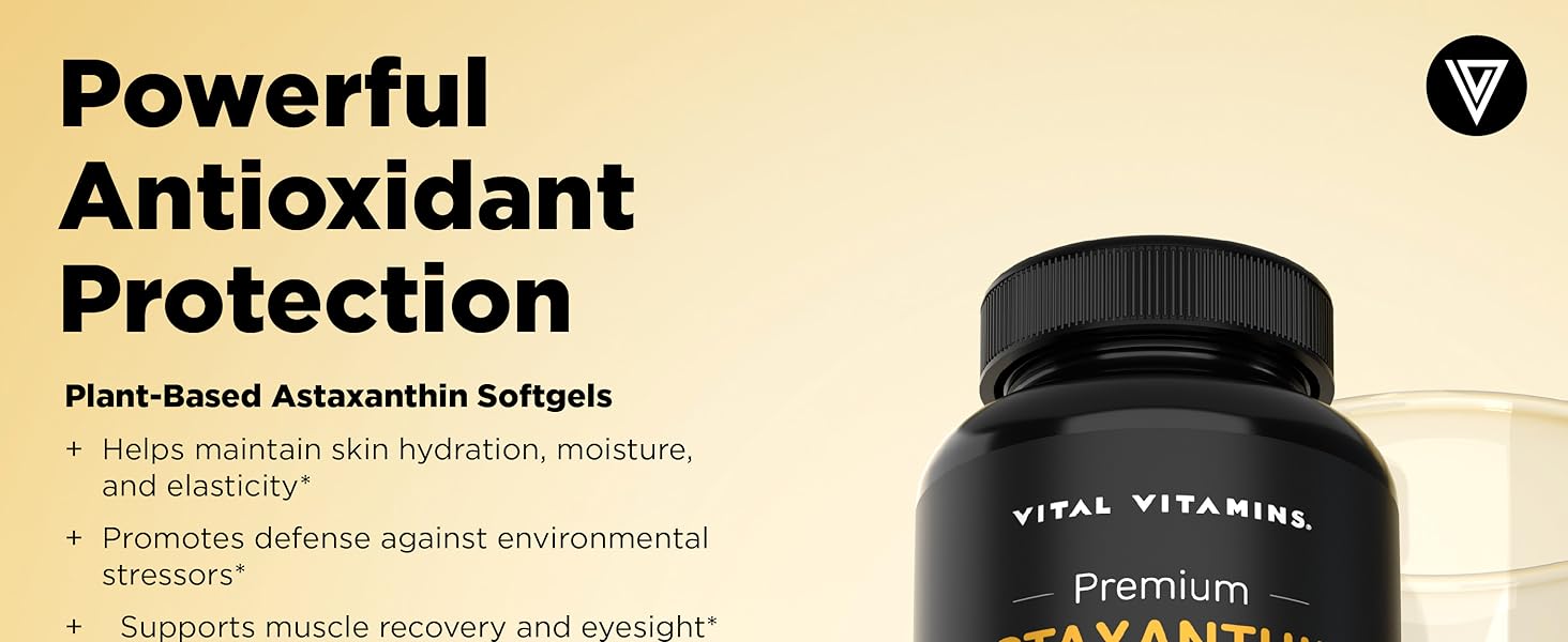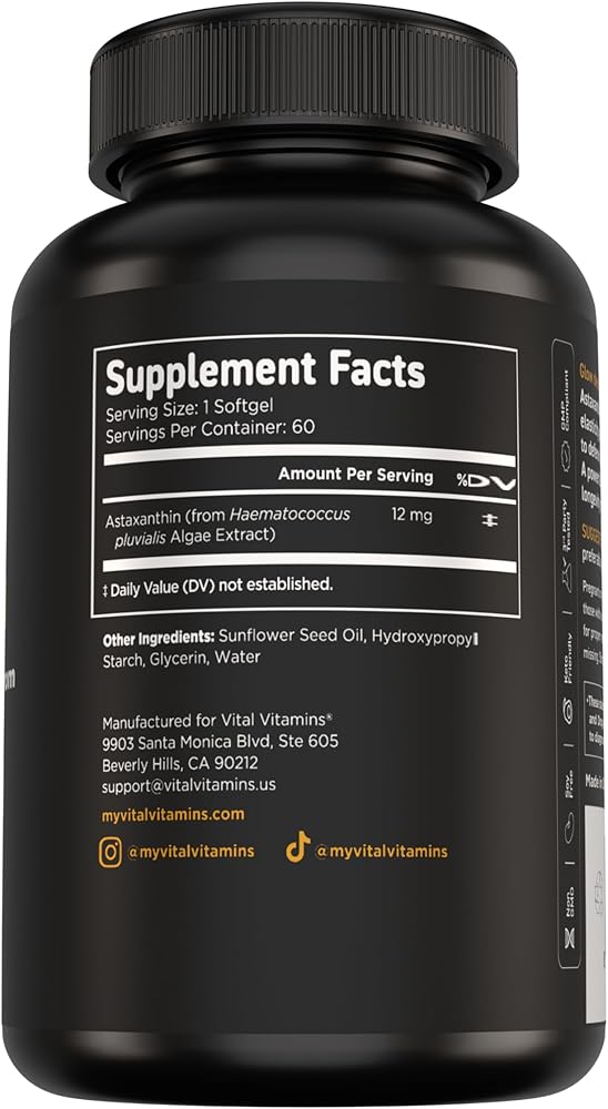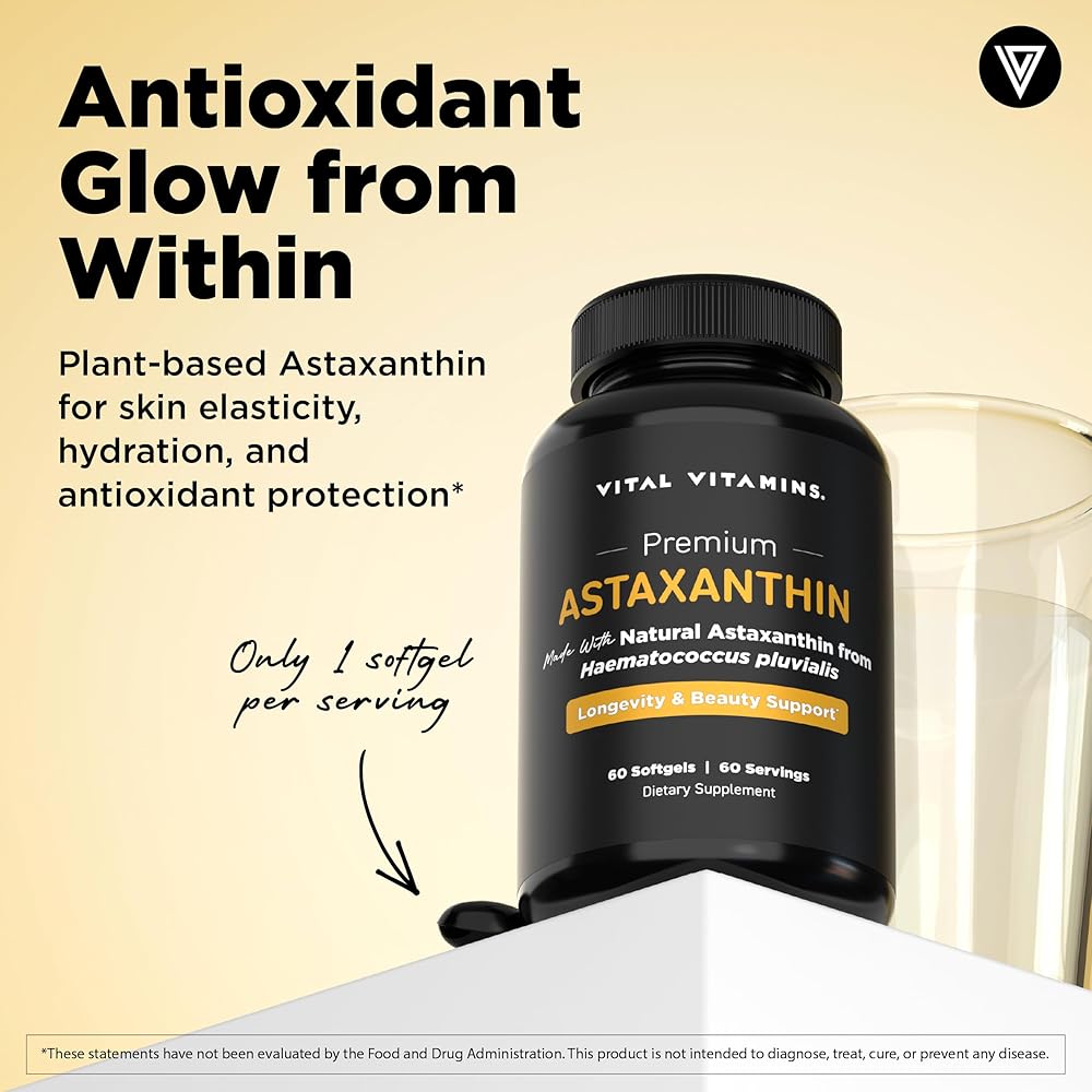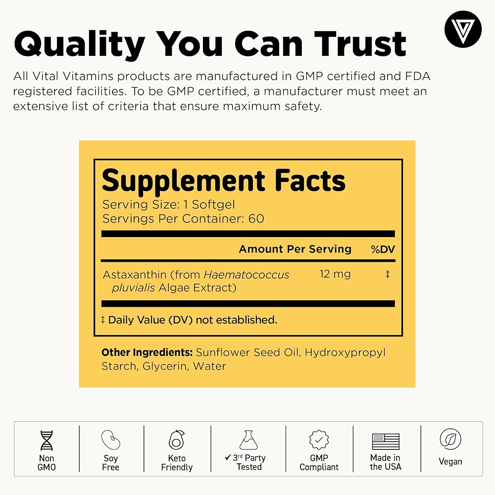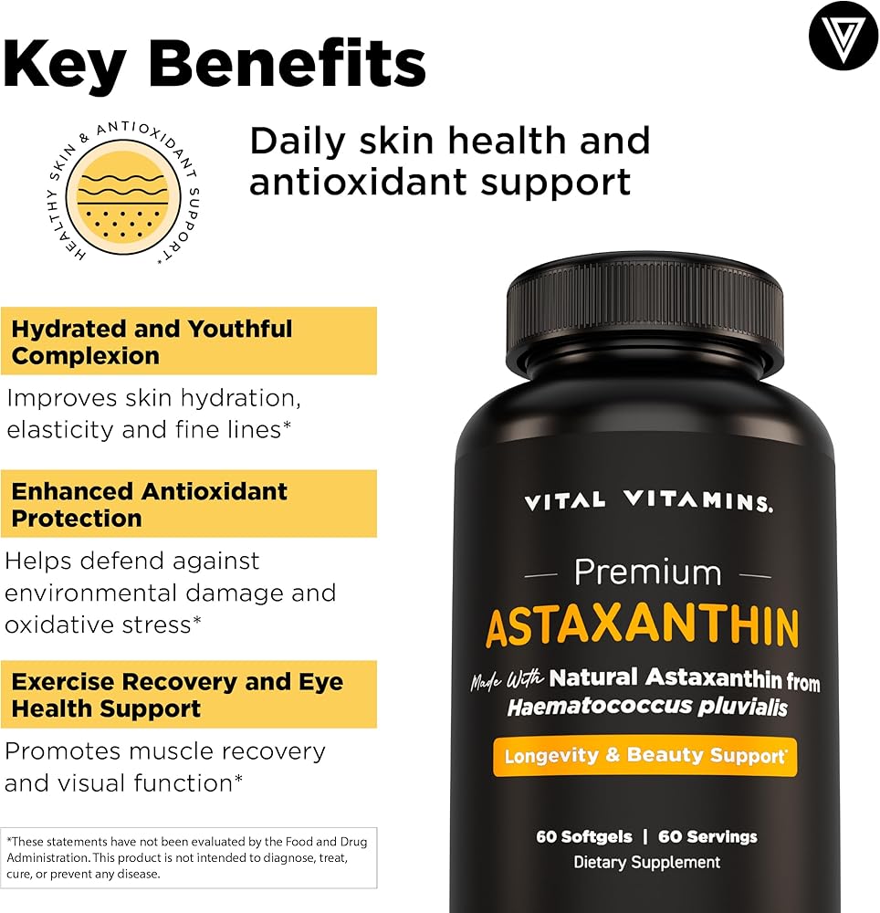 Vital Vitamins Astaxanthin 12mg Softgels - Made with Natural Astaxanthin - Supplement to Promote Skin Hydration, Elasticity - Defends Cells Against Daily Damage - Vegan, Made in the USA - 60 Soft Gels