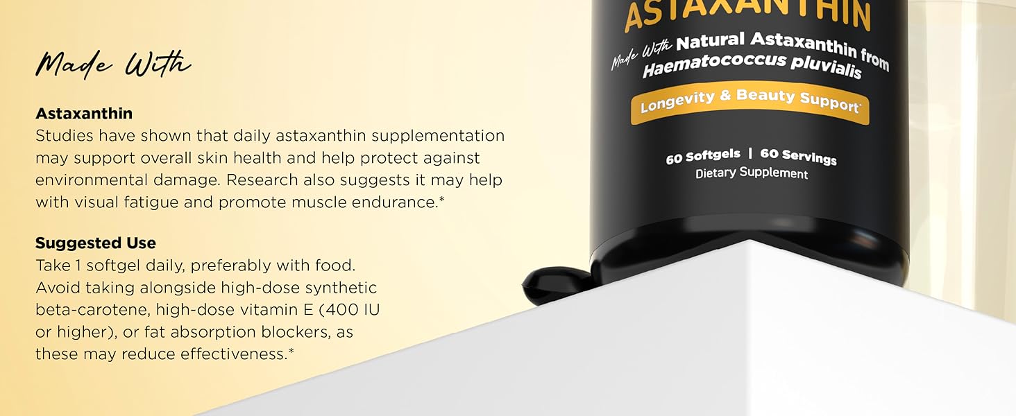 Powerful Antioxidant Defense: Astaxanthin is a potent antioxidant that helps protect cells from oxidative stress caused by daily environmental exposure. Supports skin, eyes, and overall wellness by helping maintain a healthy antioxidant balance.