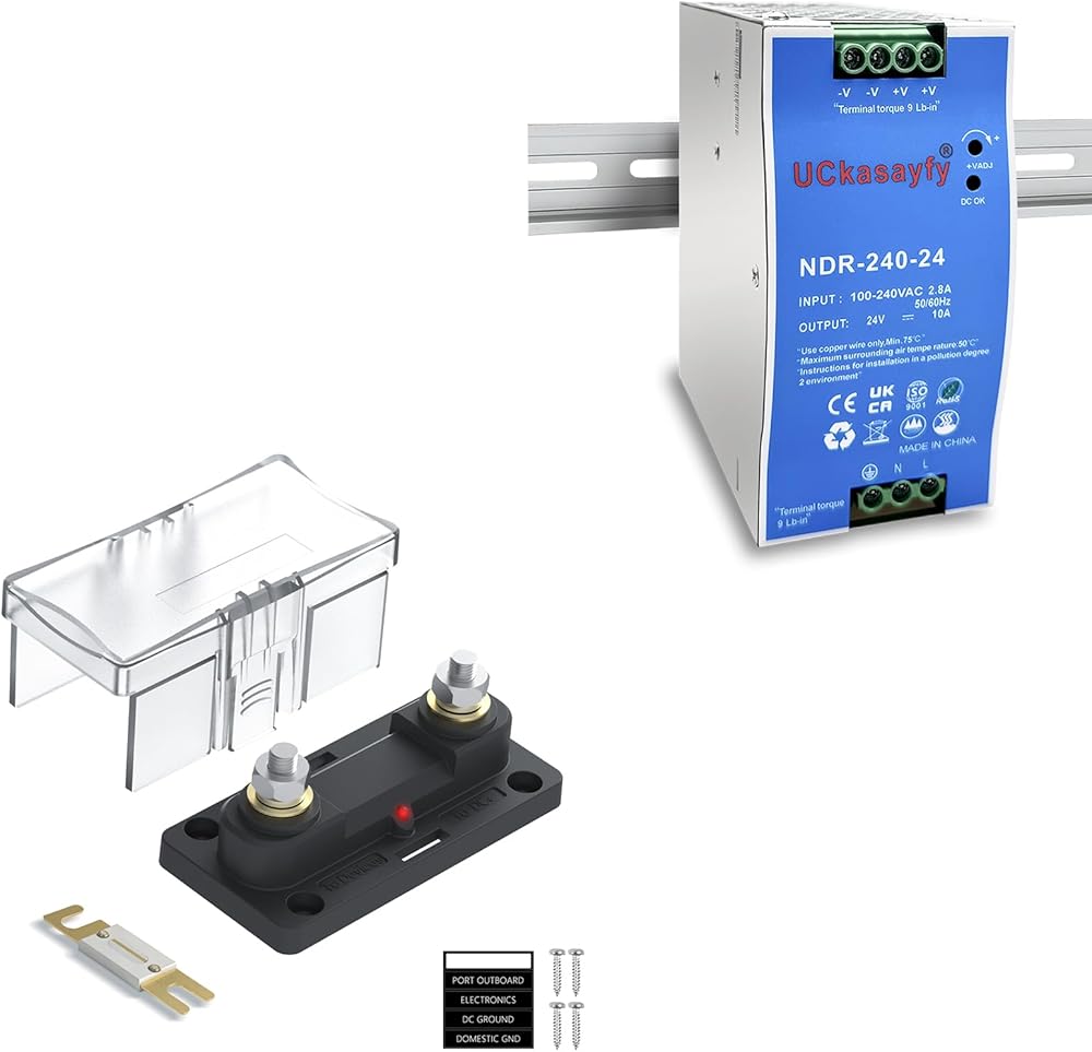 UCkasayfy NDR-240-24 DIN Rail Power Supply 24V 10A 240W Single Output, Input 100-240V AC 50/60Hz, Industrial AC/DC Switching Converter with Active PFC UCkasayfy 300A ANL Fuse Holder 0-4 Gauge AWG Fuse with M8 Stud Fuse Block with LED Indicator for Car Audio, Boat, RV, Truck, Marine