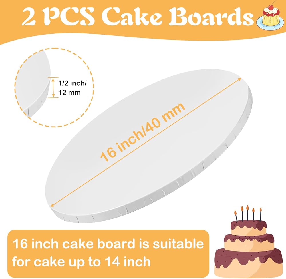 16 Inch Cake Boards: Includes 2 pcs 16 inch cake drums, diameter: 40 mm/16 inch, Thickness: 12 mm/1/2 inch. Please note: To ensure the stability of your cake, recommended 16 inch cake board for cake up to 14 inch