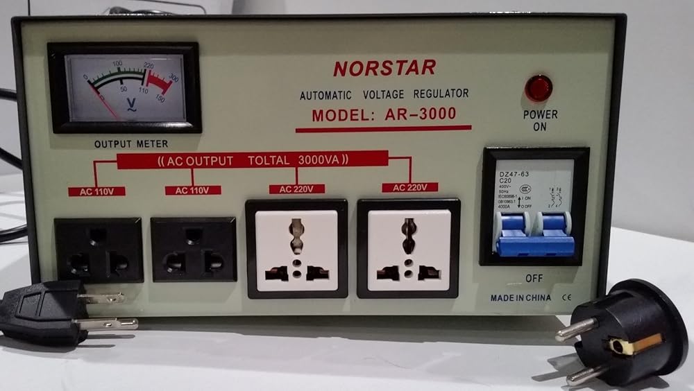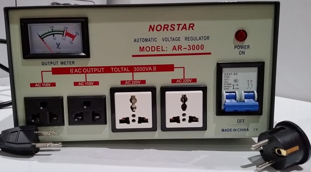 Norstar 3000 Watt Step Up and Down Voltage Transformer with Automatic Voltage Regulator Two Way Transformer Converter Works as Step UP means Converts from 110-120 Volt 220-240 Volt, - Works as Step Down means converts from 220-240 Volt to 110-120 Volt Automatic Voltage Regulator to Regulate the fluctuated input voltage Comes with Fuse Protection, Comes with 1 x 110 Volt Outlet and 2 x 220 Volt Outlet, Comes with North American Plug and European 2 Round Pin Plug Included.