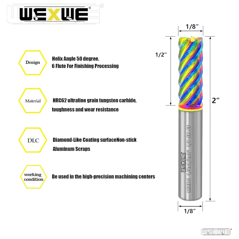 Design: High Helix Angle 50°,Six cutting edges reduce cutting load of each edge, decrease cutting volume, with high RPM, Can achieve smoother cutting surface.
